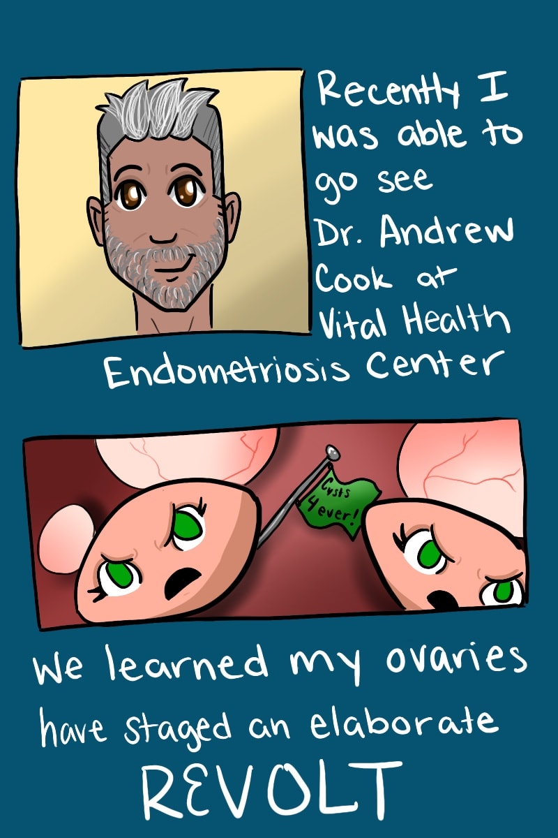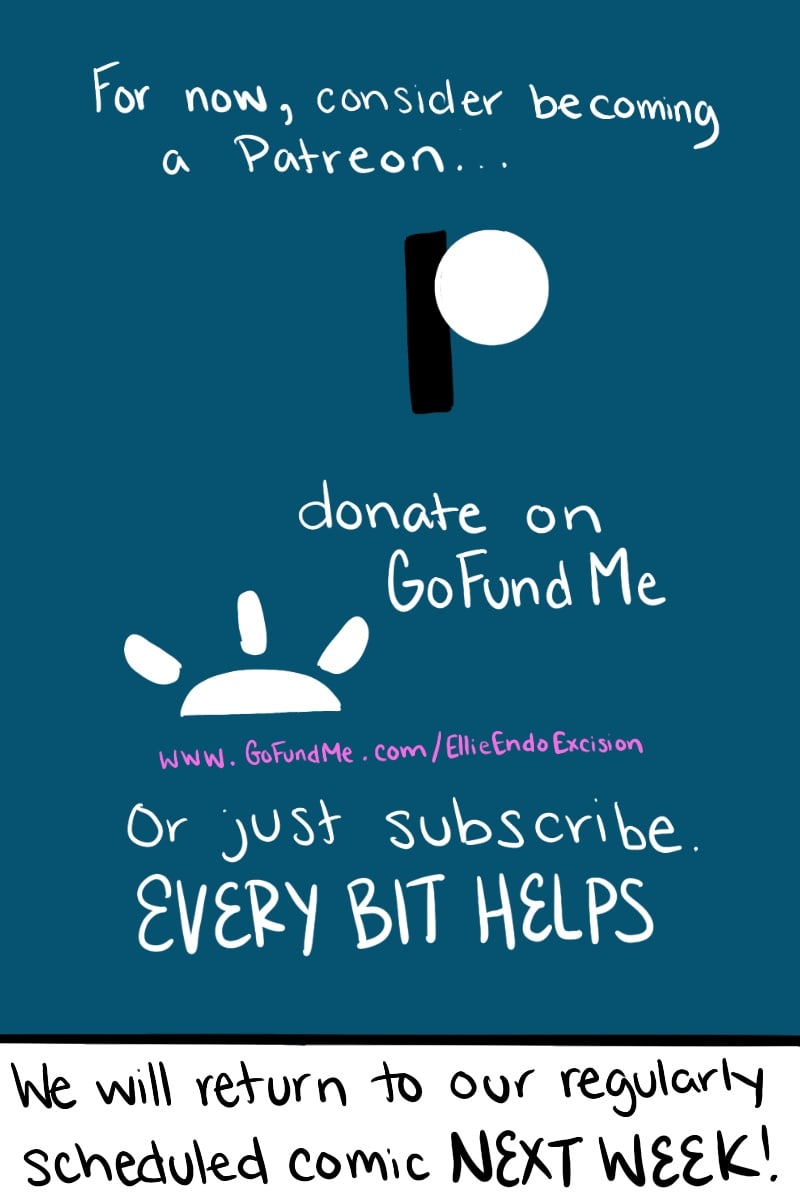 After a long hiatus I am back. And it will stay that way! These last few months without weekly comics have been needed, life has been busy, but I am excited to start up with regular content again. We had a successful cross country move, we love the area we are in, and we are working on settling in. Unfortunately my health has not followed this positive trend. My pelvic pain has increased, my repeated ovarian cysts are getting bigger and more frequent, and after meeting with one of the top endometriosis doctors in the world we have determined I need surgery. ASAP.