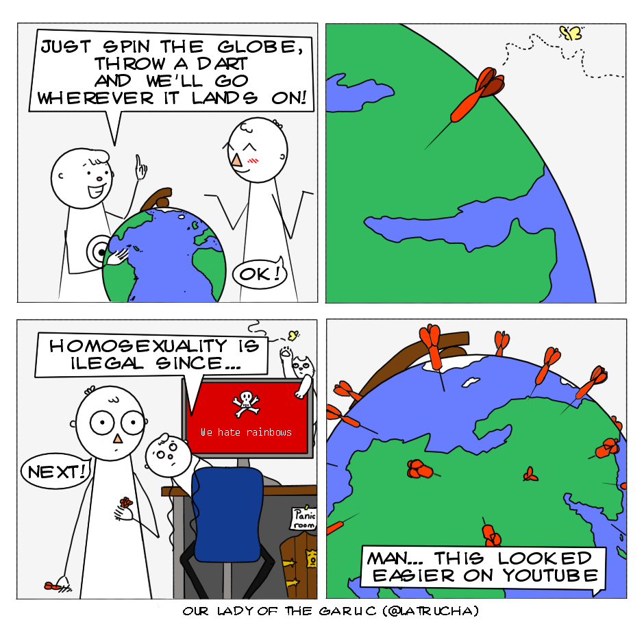 I really wanted to get this comic off my chest. It's so heartbreaking to see how many places exist where love is still illegal and being part of a more friendly country means that we online realise that whenever we have to travel abroad. So whenever you are I hope that you're safe, that you can cherish who you are and that you're happy!