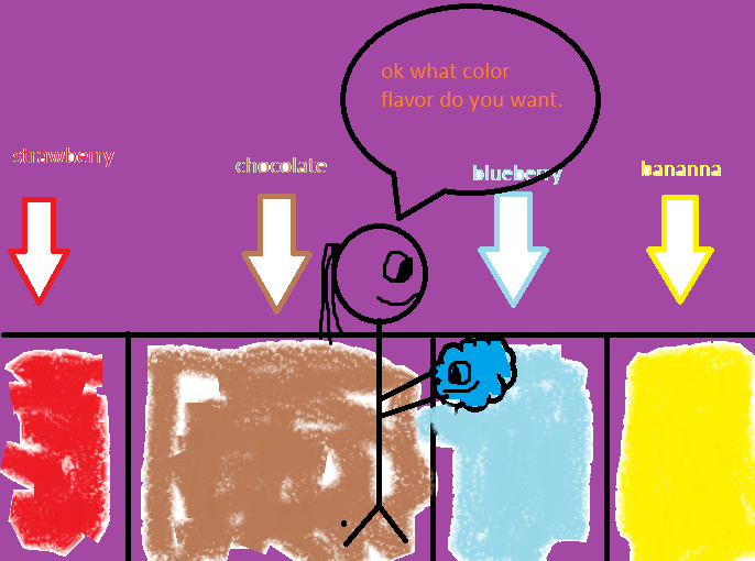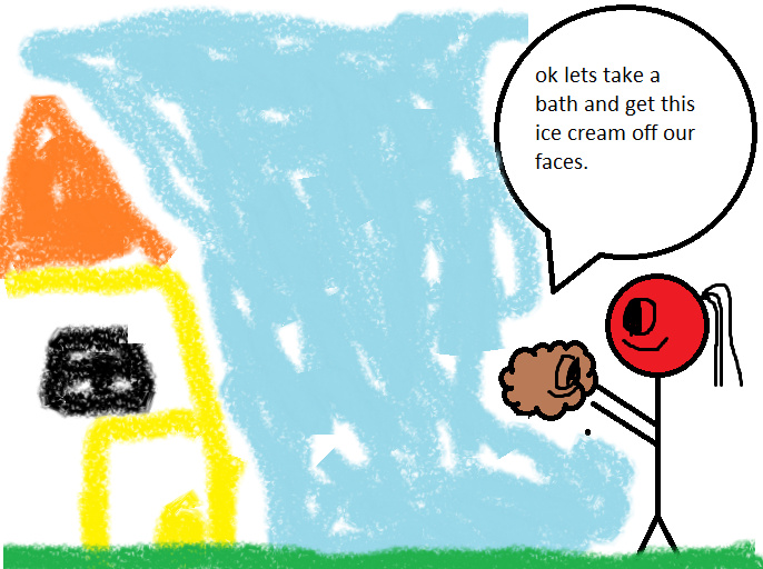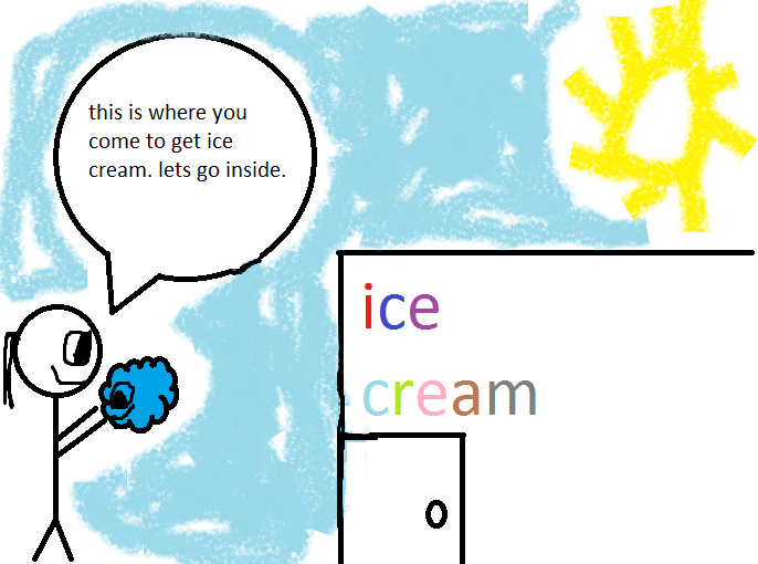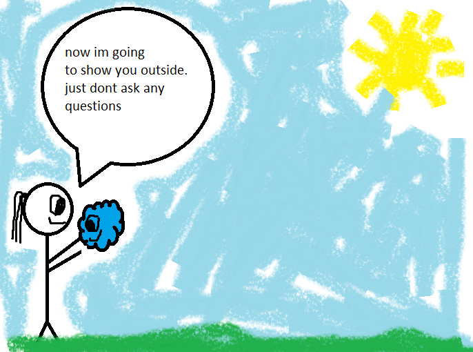 the girl takes the blue thing and shows him around outside.