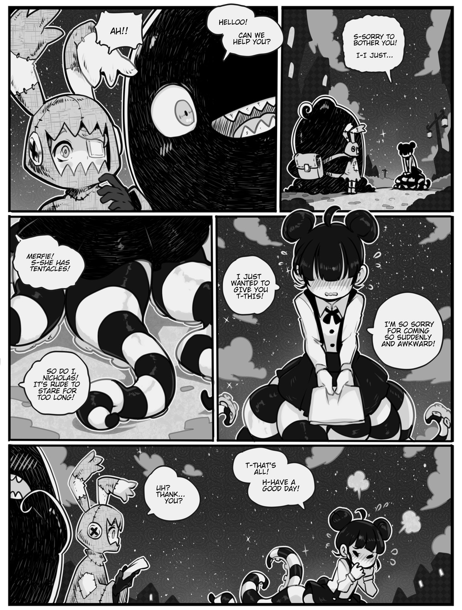The story begins where Aria and Nicholas, very confused, meet Merfie, a monster that welcomes them to his home.