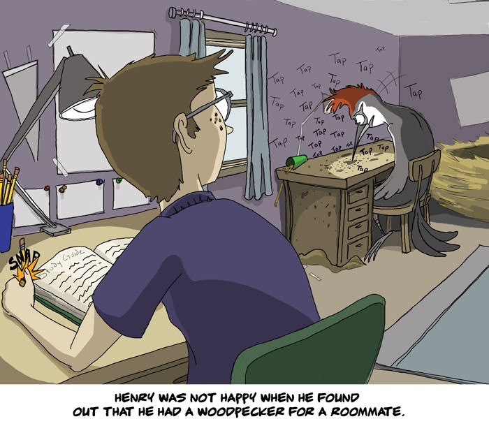 #tardy_comic #farside #far_side #woodpecker #roommate #study #school #funny #comical #funnies