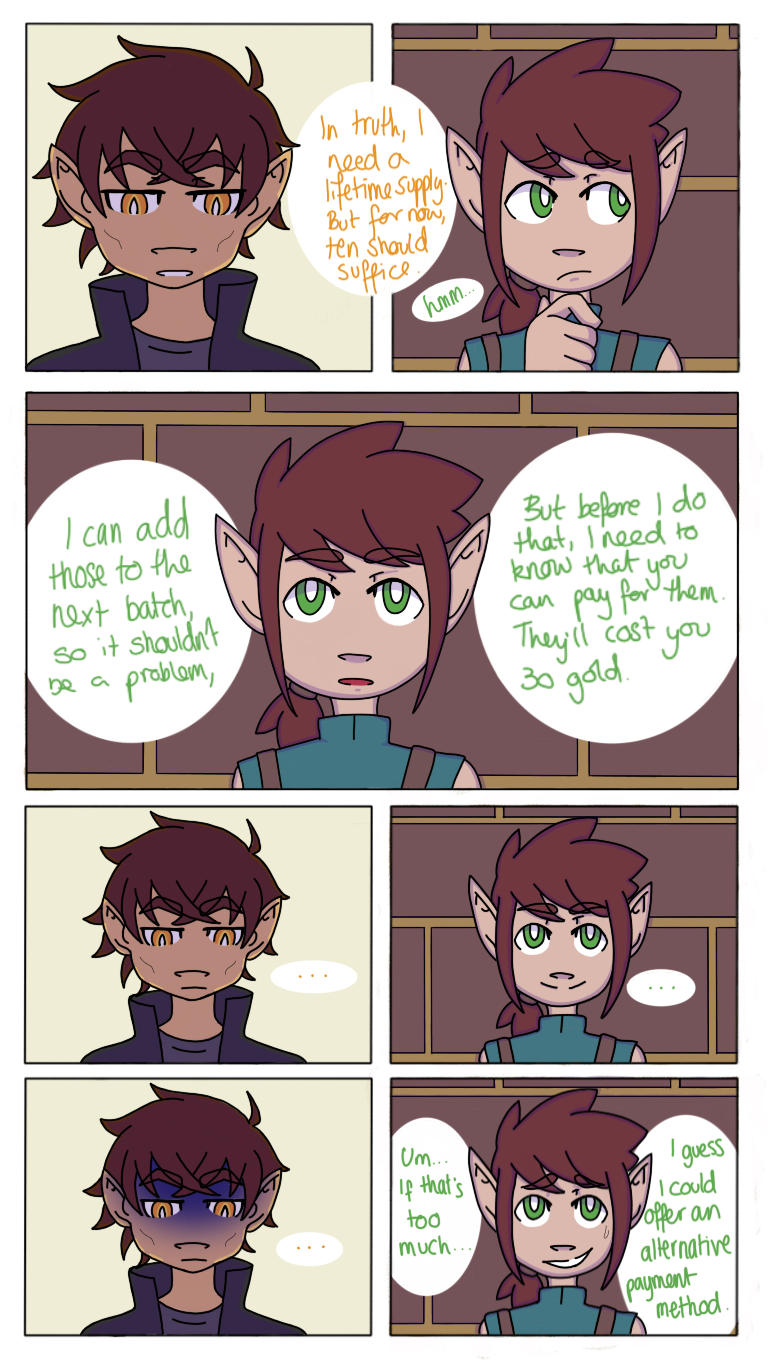 An arrangement is made, and a friendship born, but between the insecurity of a half-dragon and the pressure an elf is under to provide the one potion he refuses to make, can the pair find more in each other? Or will this become the boiling point which melts their relationship?