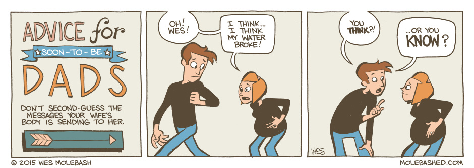 “Wesley! I THINK my water broke!” I distinctly remember her saying, “I THINK!”