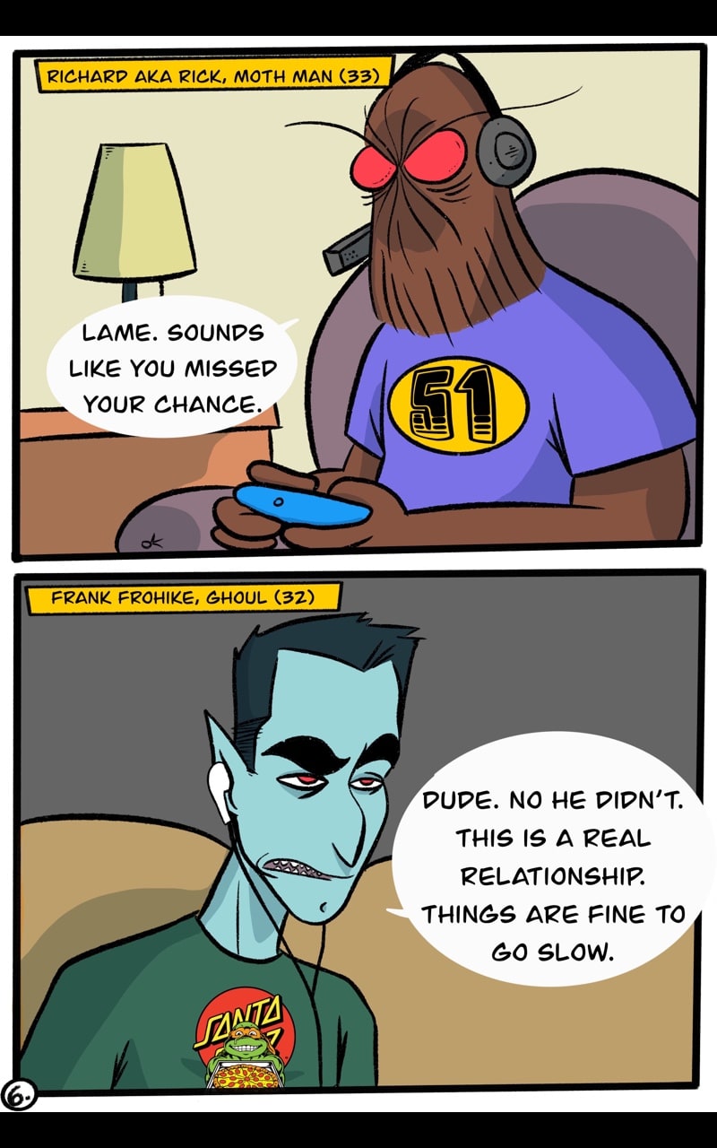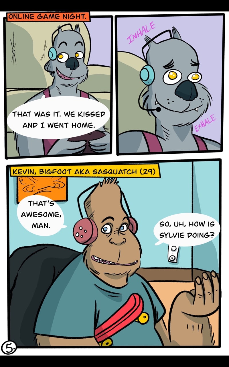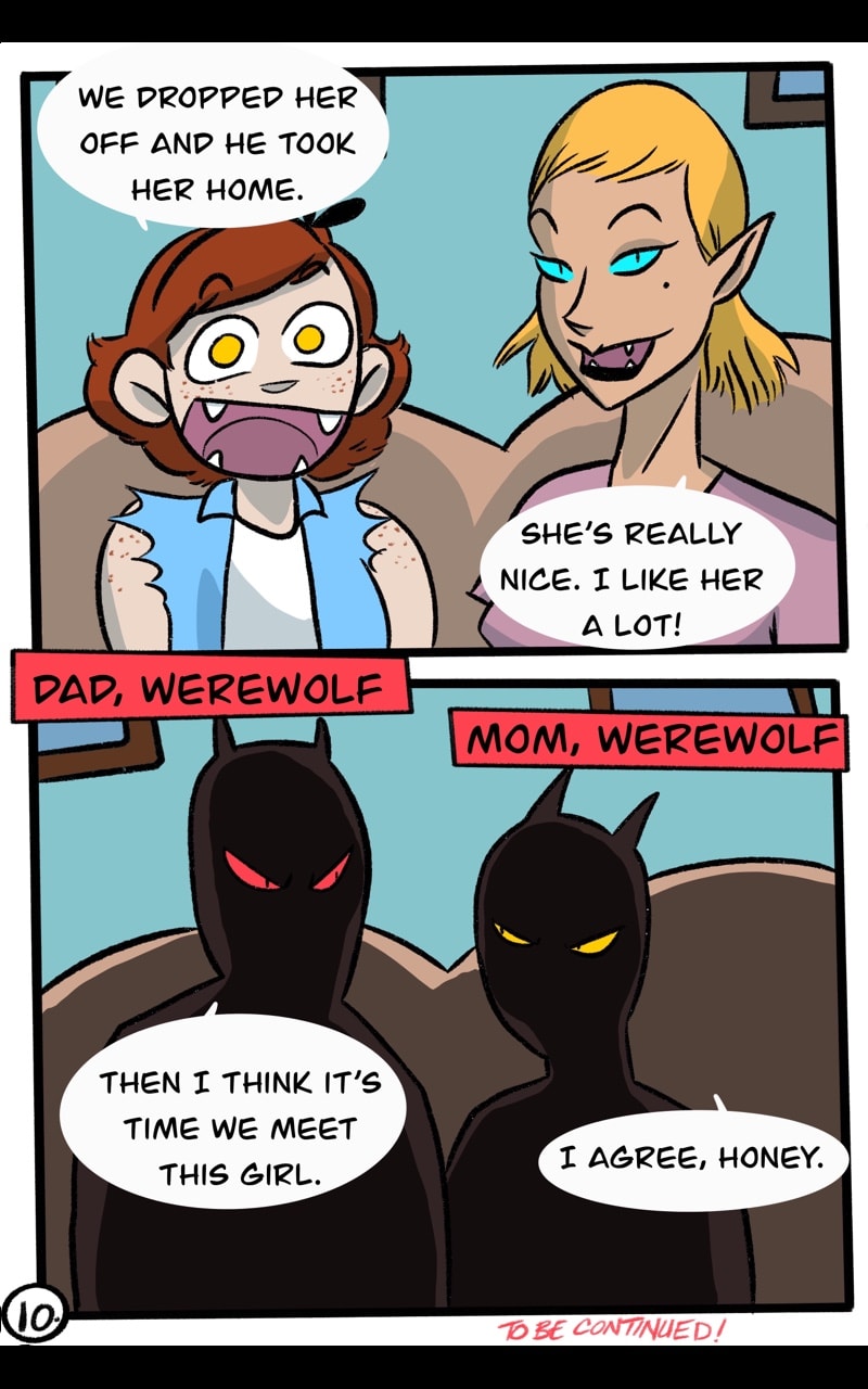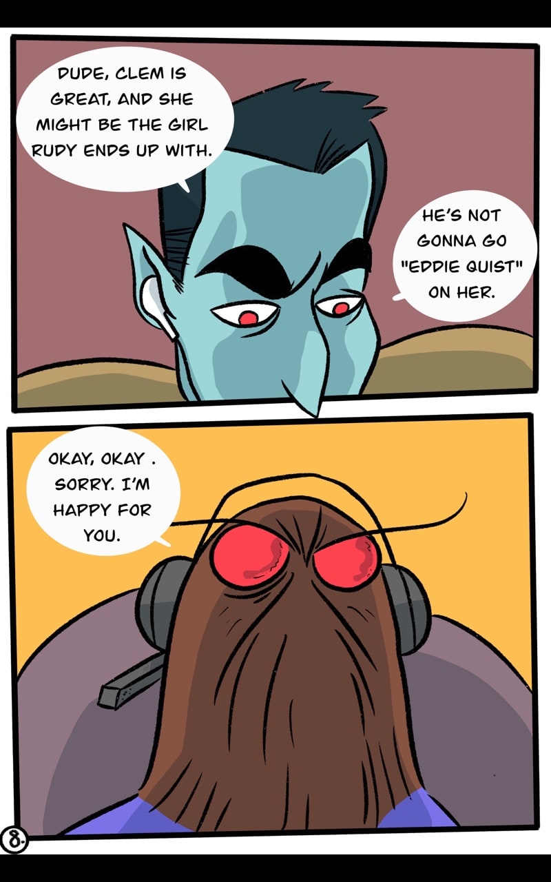 I really liked being able to introduce more monsters in this chapter. When I was thinking about adding some of Rudy's friends, I wanted to use cryptids because they are cool. Looking back I think it's also neat because this story exists in a world where monsters are real, and some people know about them, and others don't.
