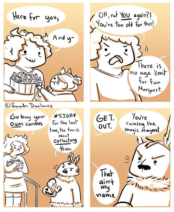 I'm 19 and would probably still go trick or treating with my friend, if it was acceptable. I plan on making signs for Halloween when I'm living on my own, making it clear that if you're in a costume, you can get candy. Hell, I might make it so there's no kids (because I hate children) and teens and adults can get candy