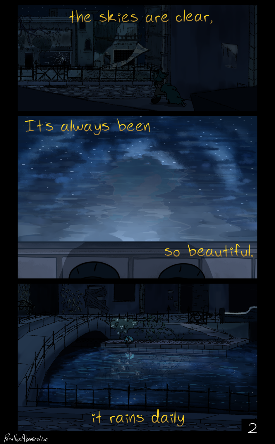 another strong page tho! still the abundance of dark colours that really represents Patchwork for me. there's a really good case of environment building in the first panel, with the broken down city block. it's very atmospheric and builds the world and mood of Patchwork in a very effective way. you can tell it's a dark, dangerous place that's had some sort of unknown apocalypse-like event in the somewhat distant past. the ripple effect is very well done too! though personally I find that Boot's reflection gets a bit lighter closer to the edge/waist area? that's just me though. but it's a great showcase of the night sky above! it makes me miss Paint Tool Sai a bit, as that brush was really fun for me to use. I did a lot of fun stuff with that brush. it's still a very well rendered clear night sky! the milky way effect really breathes life into this page>
