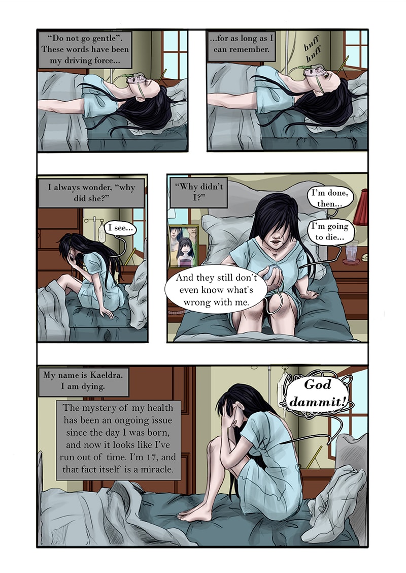 As she lay dying in her bed, Kaeldra decides to take what is left of her life into her own hands and runs from her hospital room, and those that love her. This ironically allows her to find a character that offers her a life she could have never imagined, and so much more. Monster-of-the-week style Updates weekly.