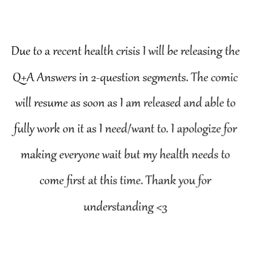As I said in the announcement, due to health concerns I will be unable to post the actual updates at this time. I promise I will get them out as soon as I am released. Until then the Q+A Answers will be released in 2-question segments. Thank you so much for your continued support <3