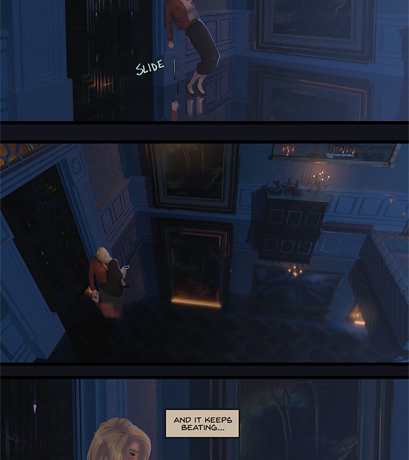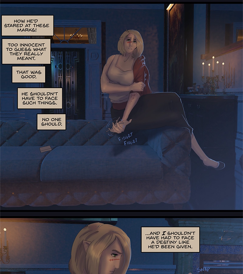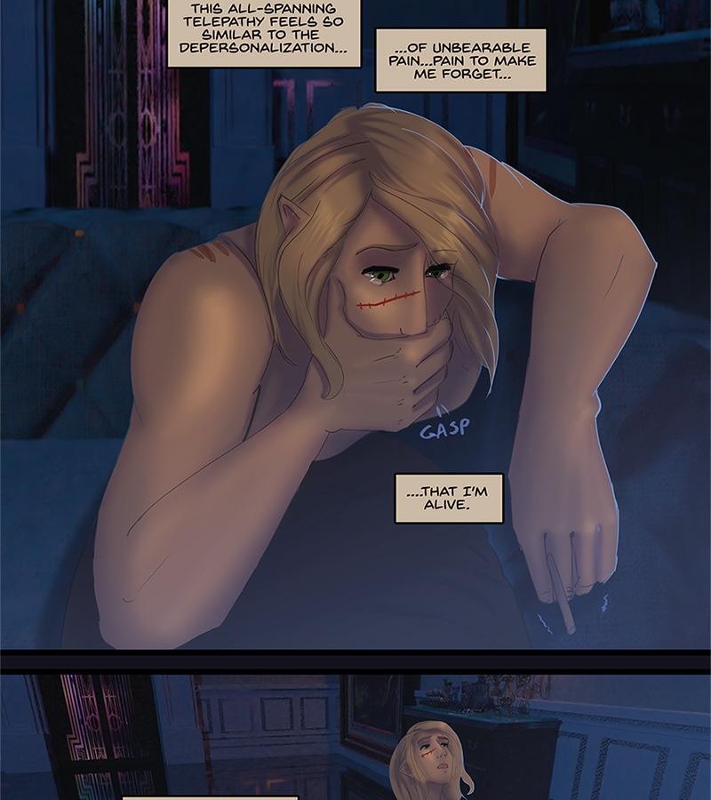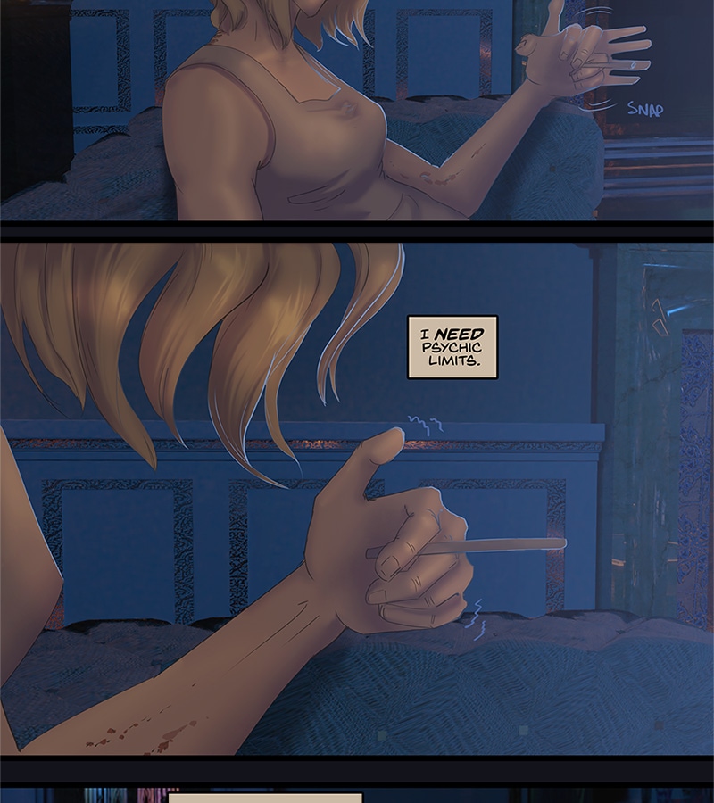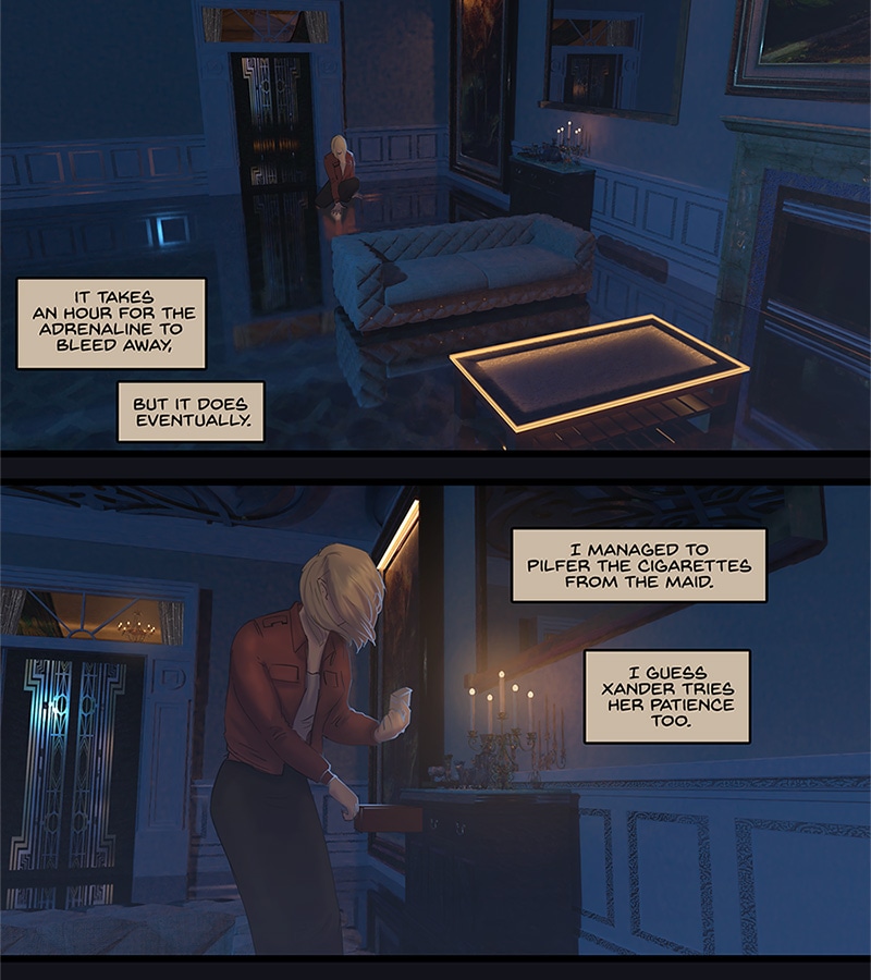 Kore walks back alone to the set of rooms that Xander's been stashing her in since about episode 7. She does not turn on the lights but there's some nice candles. She sinks to the floor while trying to recover from the huge rush she's experienced what with Xander being all charming for a change. Then she steals the maid's cigarette stash-- she's super good at finding stashes of this junk eh? -- and instead of lighting it, spends all this time doing sleight-of-hand with it as a kind of a nervous tic. Meanwhile she decides that telepathy is really addictive, that Xander is really addictive, and that she should know better than to give in to addictions. By the end though, her mind is across the palace doing some snooping. She's weak. Wwweeeeaaaaakkkkk...