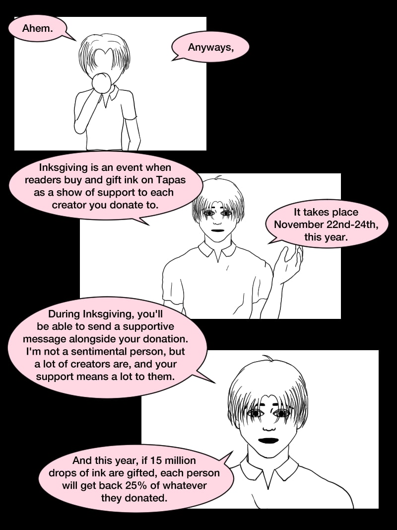 I kind of threw this together quickly while working on my buffer, I apologize that it's just line drawings, but I wanted to get back to working on the buffer ASAP. I plan on donating some ink to my favorite creators out there this Inksgiving! It'll be my first time experiencing the event, so I'm excited! Go out there and support your favorite creators!
