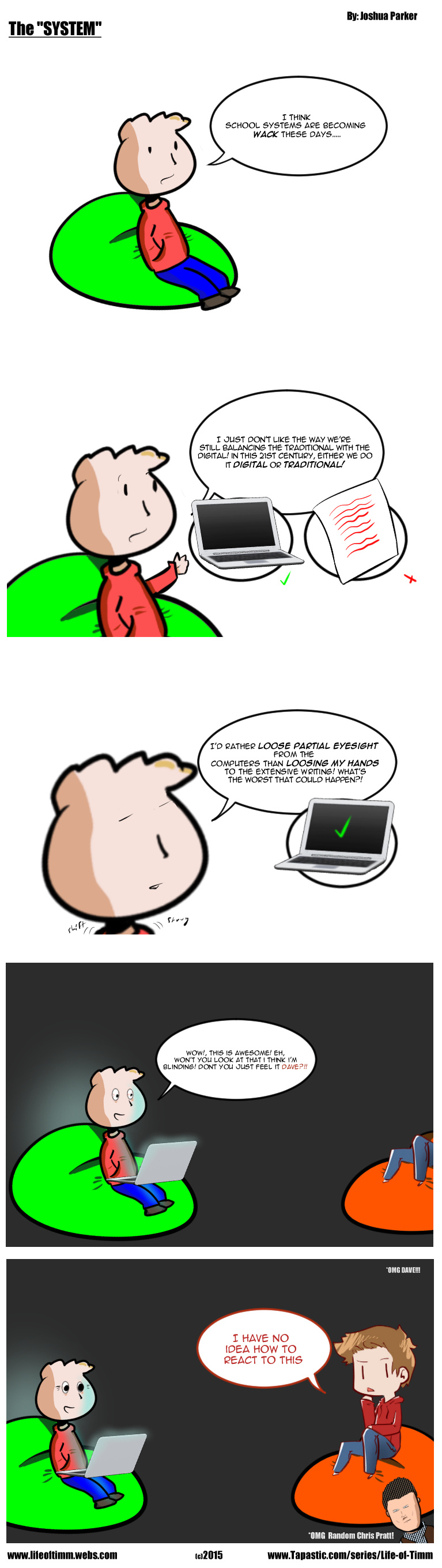 TimmTales! (Life of Timm Adventures), a weekly 5 (or more) panel vertical comic strip focusing on a week in the life of Timmy Toms, a 6th grader attending Scorchwood Intermediate!
