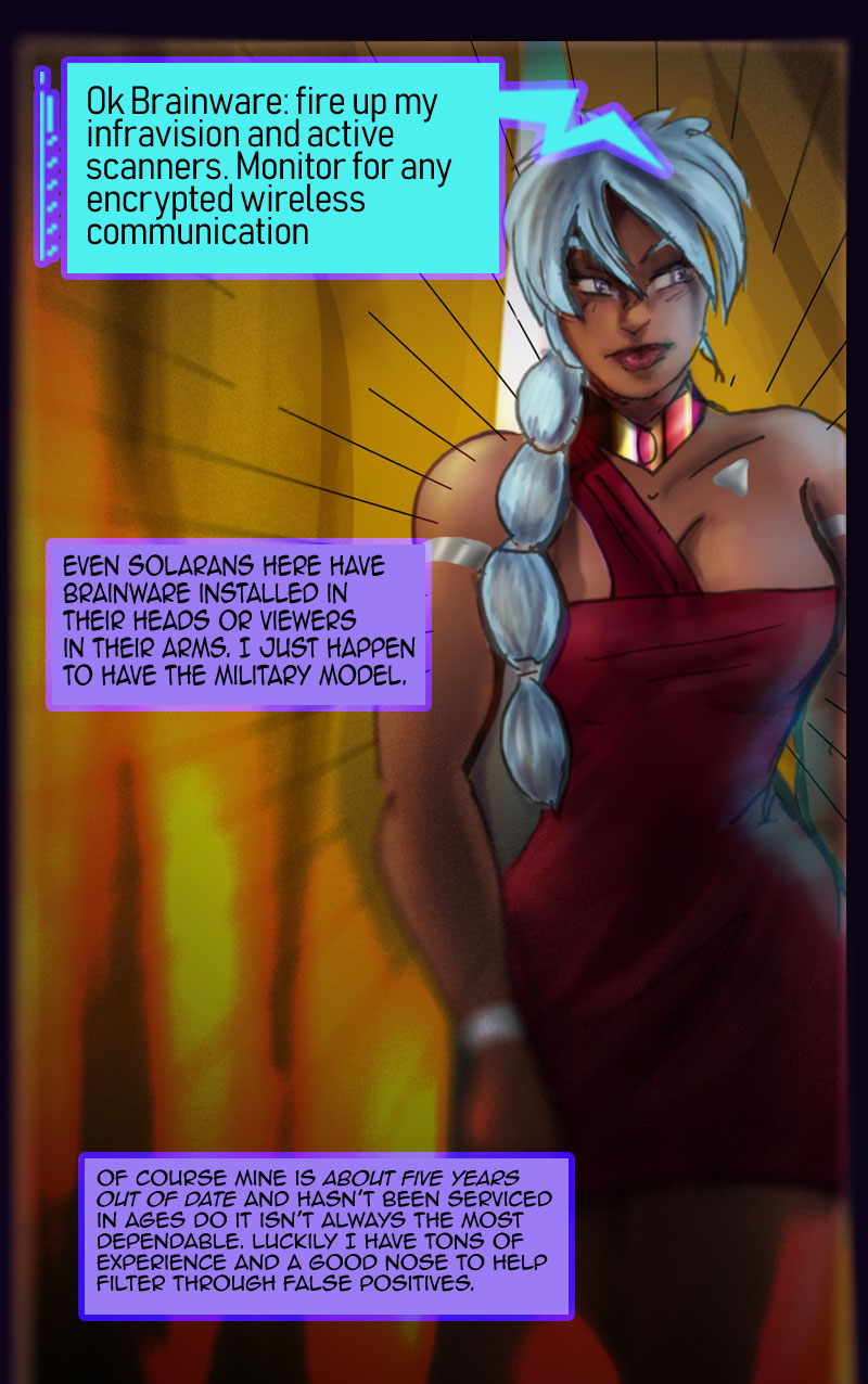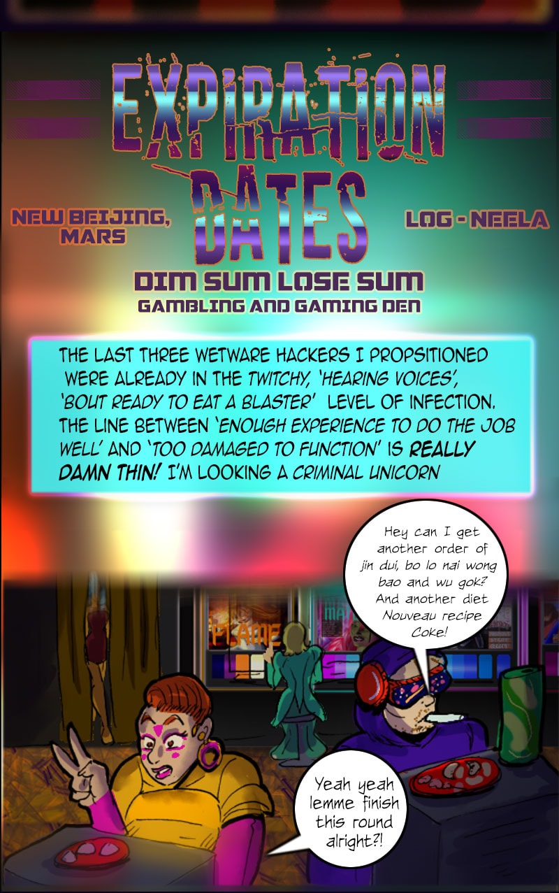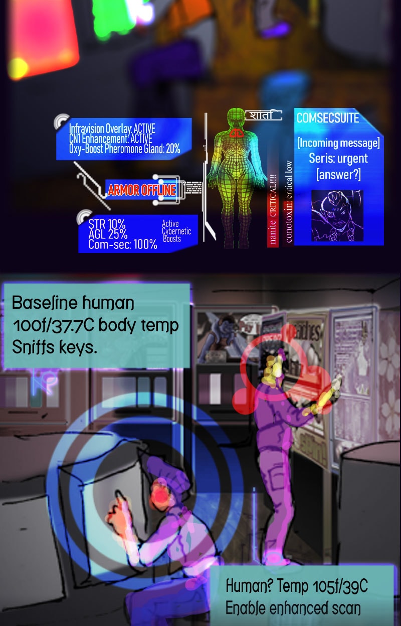 Time to check out the back room sketchy gambling nook and a few of the folks doing their thing back there. And Neela...sure he'd show you something even more interesting if you'd as before loading up your databanks with heat vision lewds.