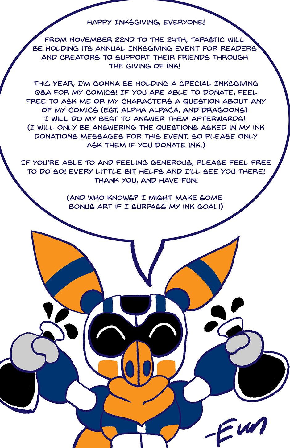 Basically, if you donate ink to me during the Inksgiving event, you can ask me or my characters nearly any question you want about my comics in your support message and I will leo my best to answer them afterwards in a special comic!