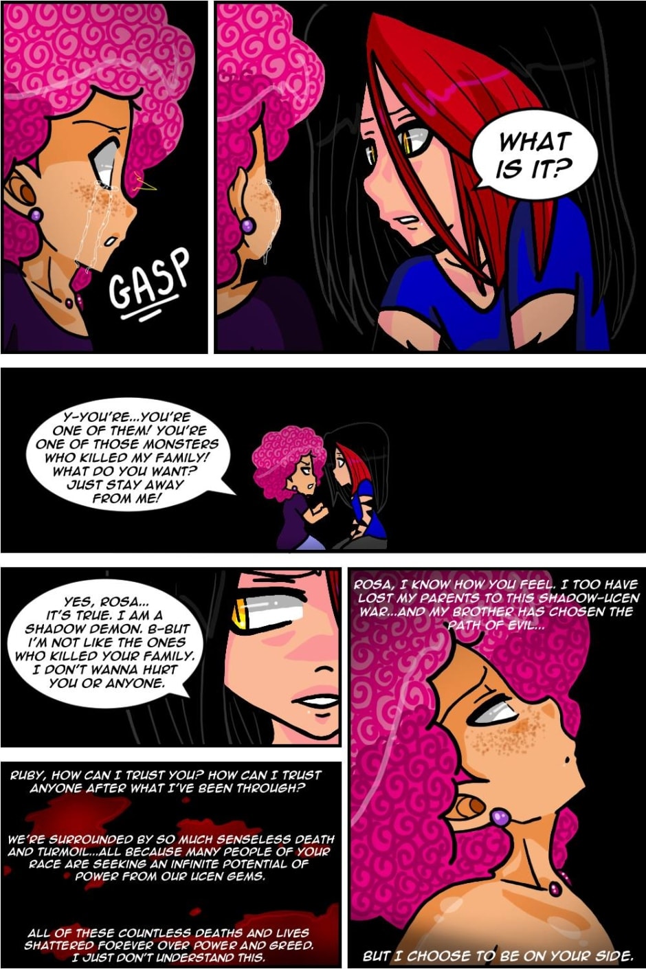 Yikes!!! Starting heavy! O.O lol So as told in the backstory episode, Rosa's family was killed by a Shadow Demon seeking their Ucen Gems for more power when she was a child. Her feelings are pretty deep though because it shows the conflict she probably still has sometimes regarding her relationship with Ruby. Shadow Demons killed her family and yet the irony is that she has fallen in love with one. <3 It's crazy how life works sometimes! O.o