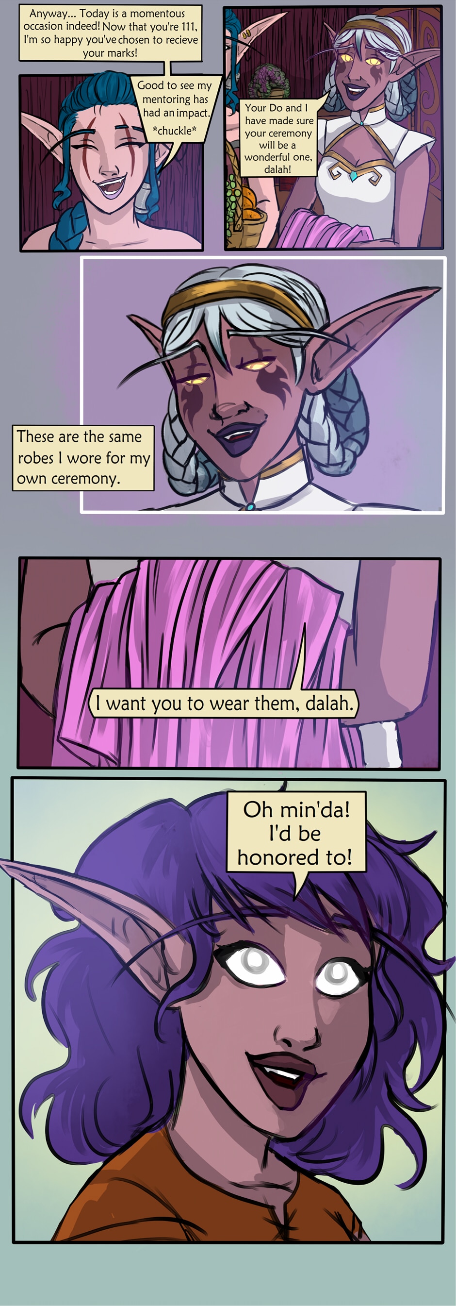 NOTE: In Kaldorei (night elf) culture, female elves usually choose to receive marks (tattoos) on their eyes when they reach 110ish in age, to signify becoming an adult.