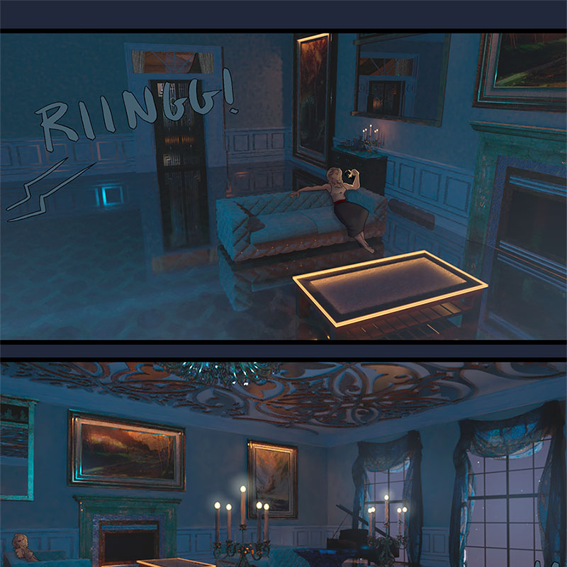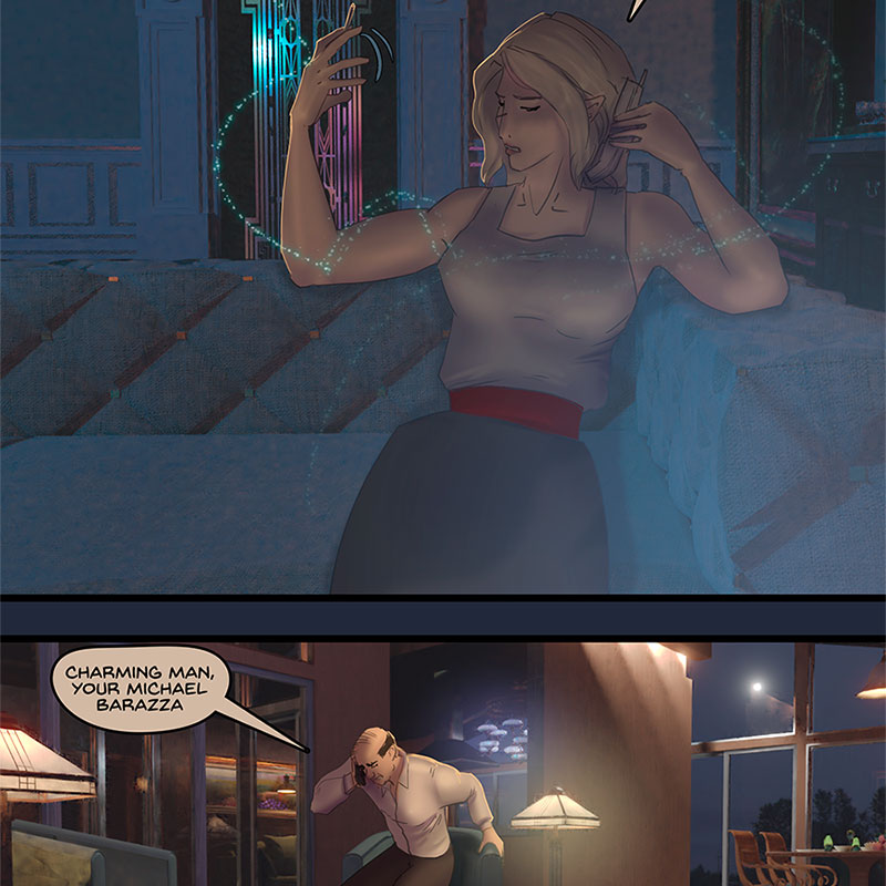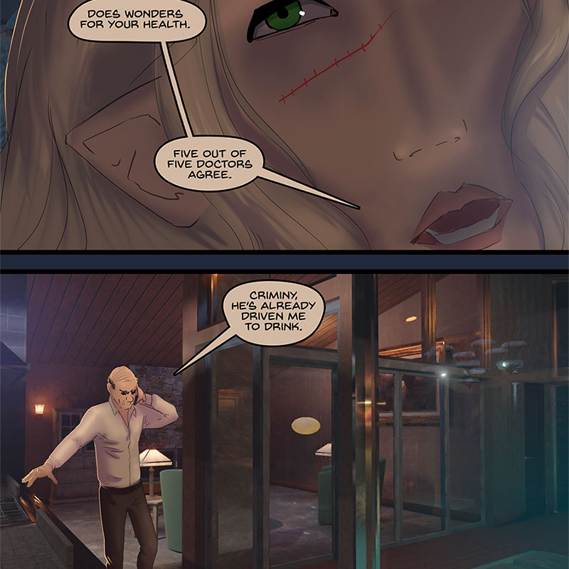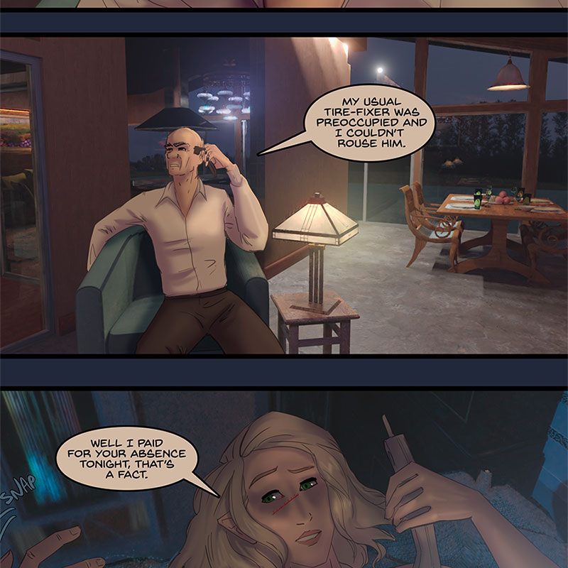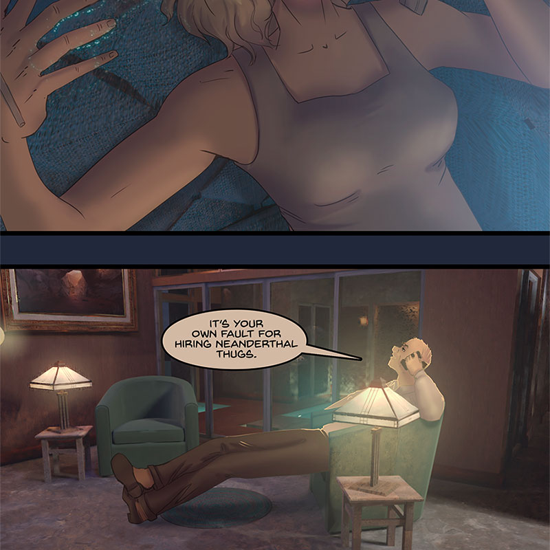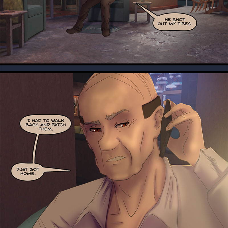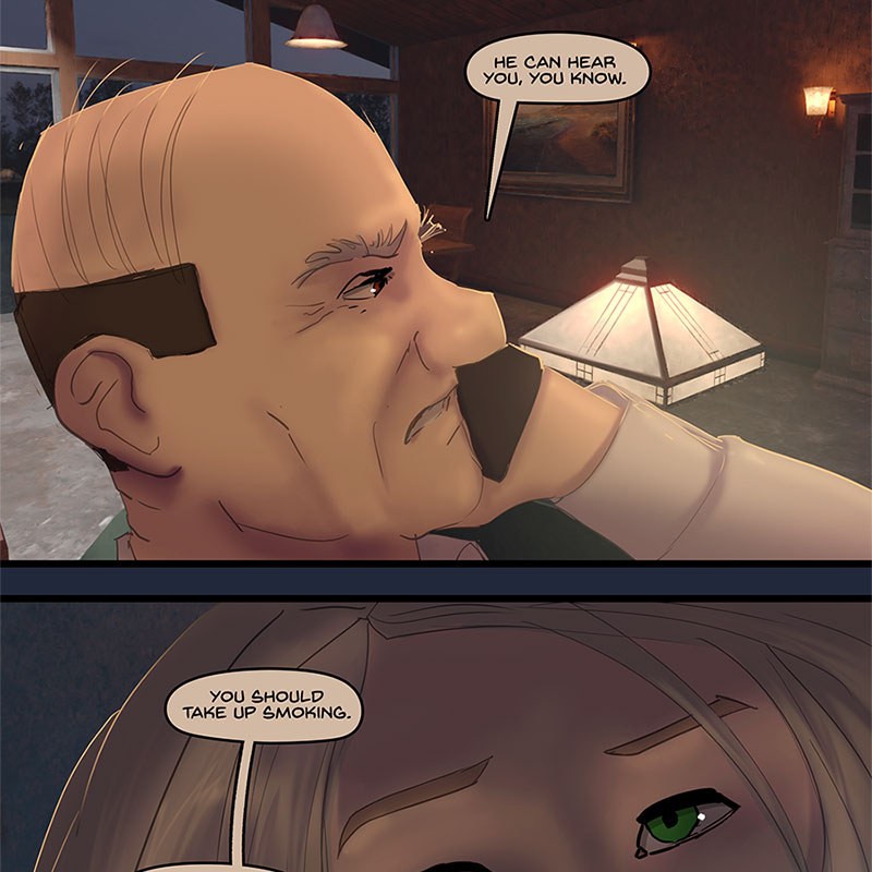The phone rings, Kore answers it, flexing a bit more of Xander-style power than she’s been doing in public recently. It’s Grant, here to check in after his afternoon adventures with Kore’s goon squad. Grant makes a dig at Xander for not fixing his tires and Kore follows it up with an another one. Grant warns her that Xander could be listening in, and Kore spins up a yarn about how Xander can’t read the mind of a smoker for a few minutes, she hasn’t stopped fiddling with that unlit cigarette. Grant instantly gets up to rummage his house for some smokes though, don’t need to tell him twice. Xander settles in with another beer, after giving Kore a silent look of warning. Perhaps he doesn’t know what she’s up to, perhaps he does. He’s going to play along. Grant is in for it now. However Grant expresses doubt at Kore’s lie. Xander and Kore share a smirk at this. No fooling Grant.