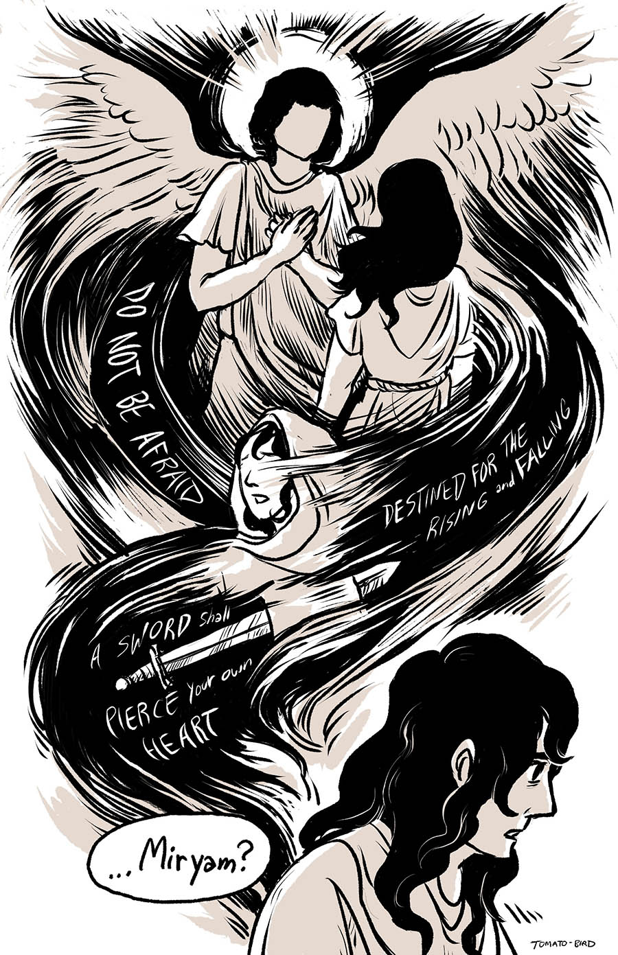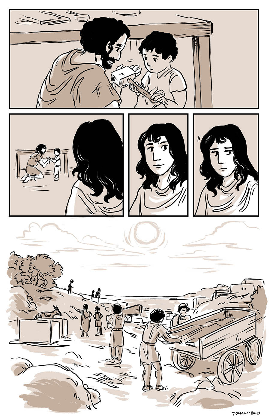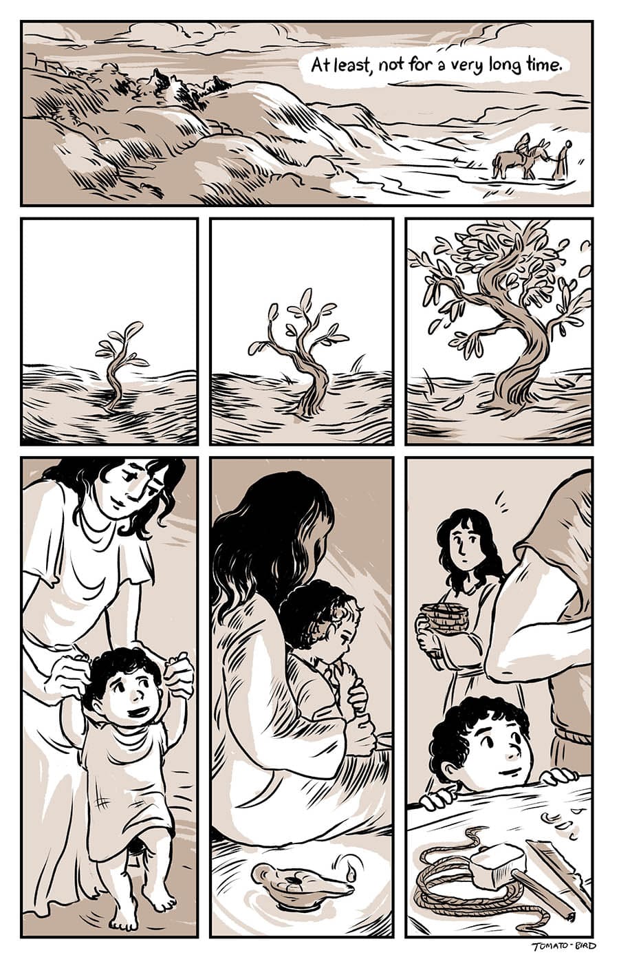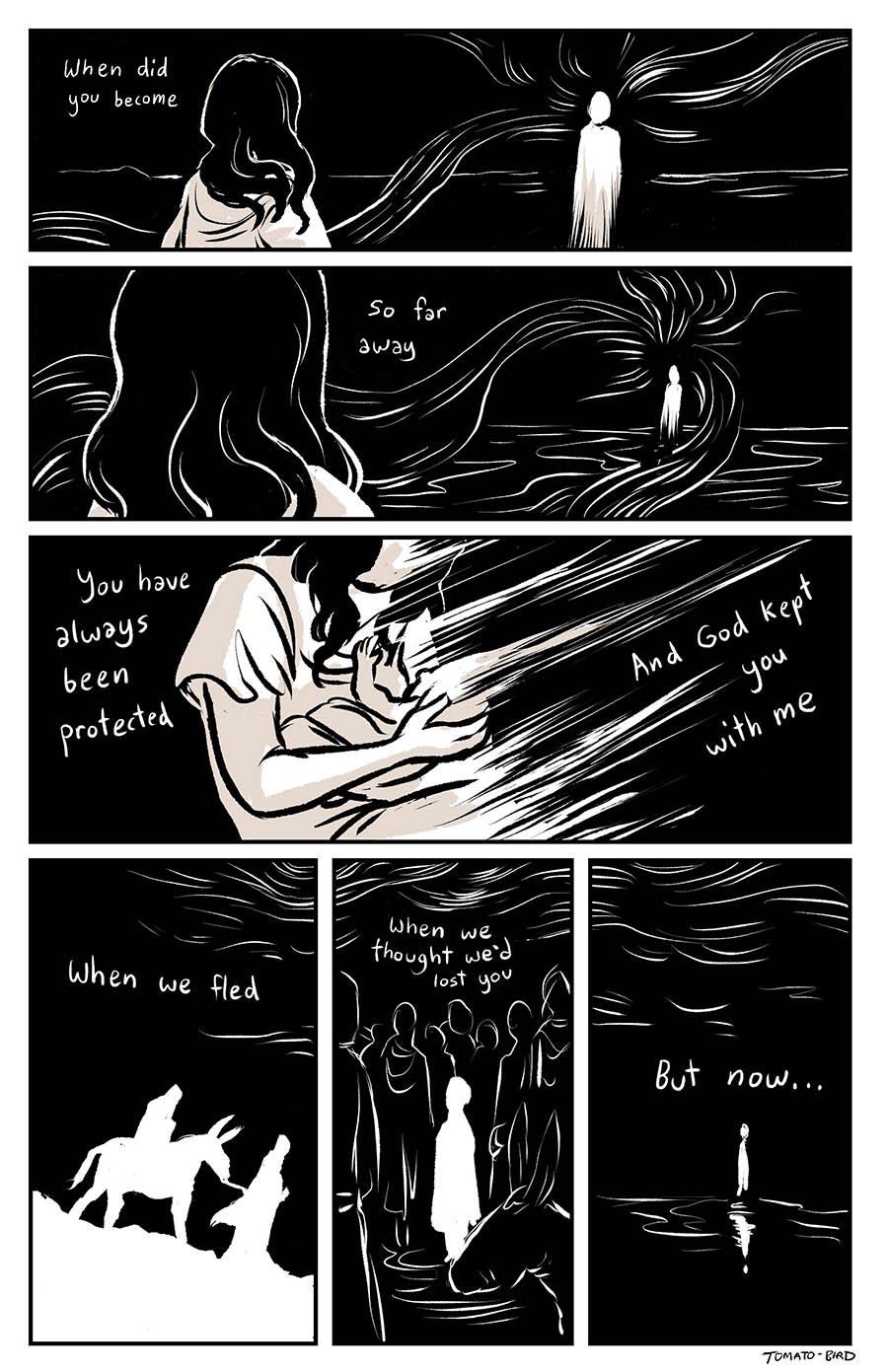This comic was originally inspired by the fact that so much art depicting Mary and Jesus traditionally usually focus on either Jesus’ birth or his death, and very little about their relationship in the time between, especially when it comes to Jesus’ life before he started his ministry at “around thirty years of age” as the Gospel of Luke states. With this story, I wanted to give a little view of Mary and her life, showing how she related to her son, her husband, and the world that they lived in. Mary is someone who, in scripture, is aware of herself, her world, and her situation, who “ponders things in her heart” and who proclaims and gives prophecy of God “casting down the mighty from their thrones and uplifting the humble.”