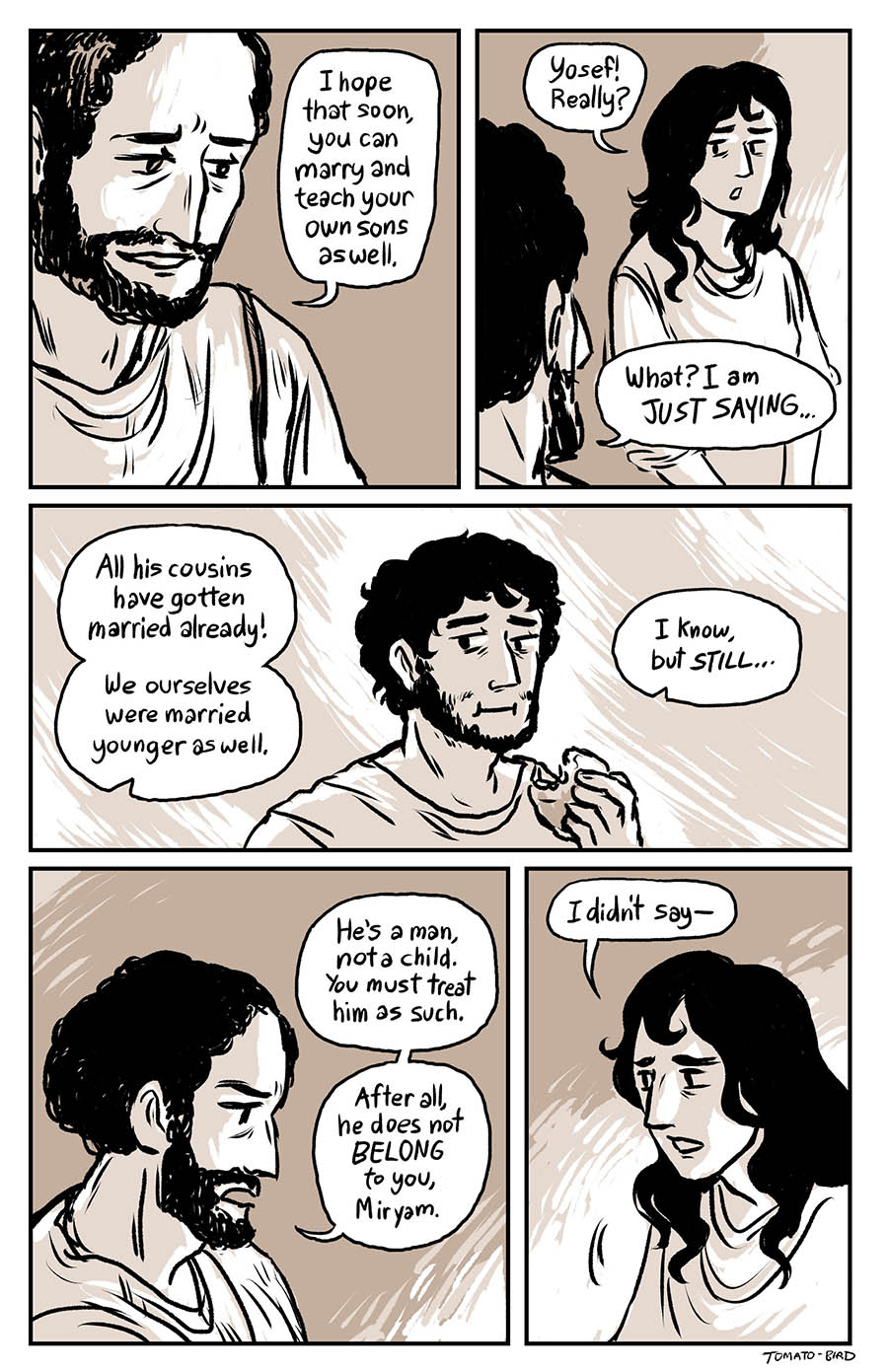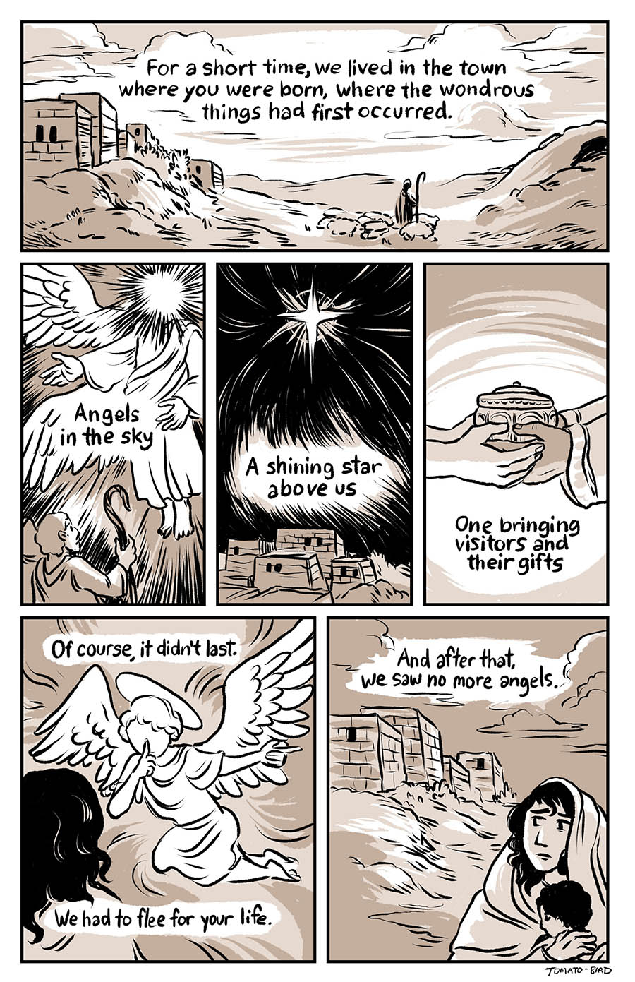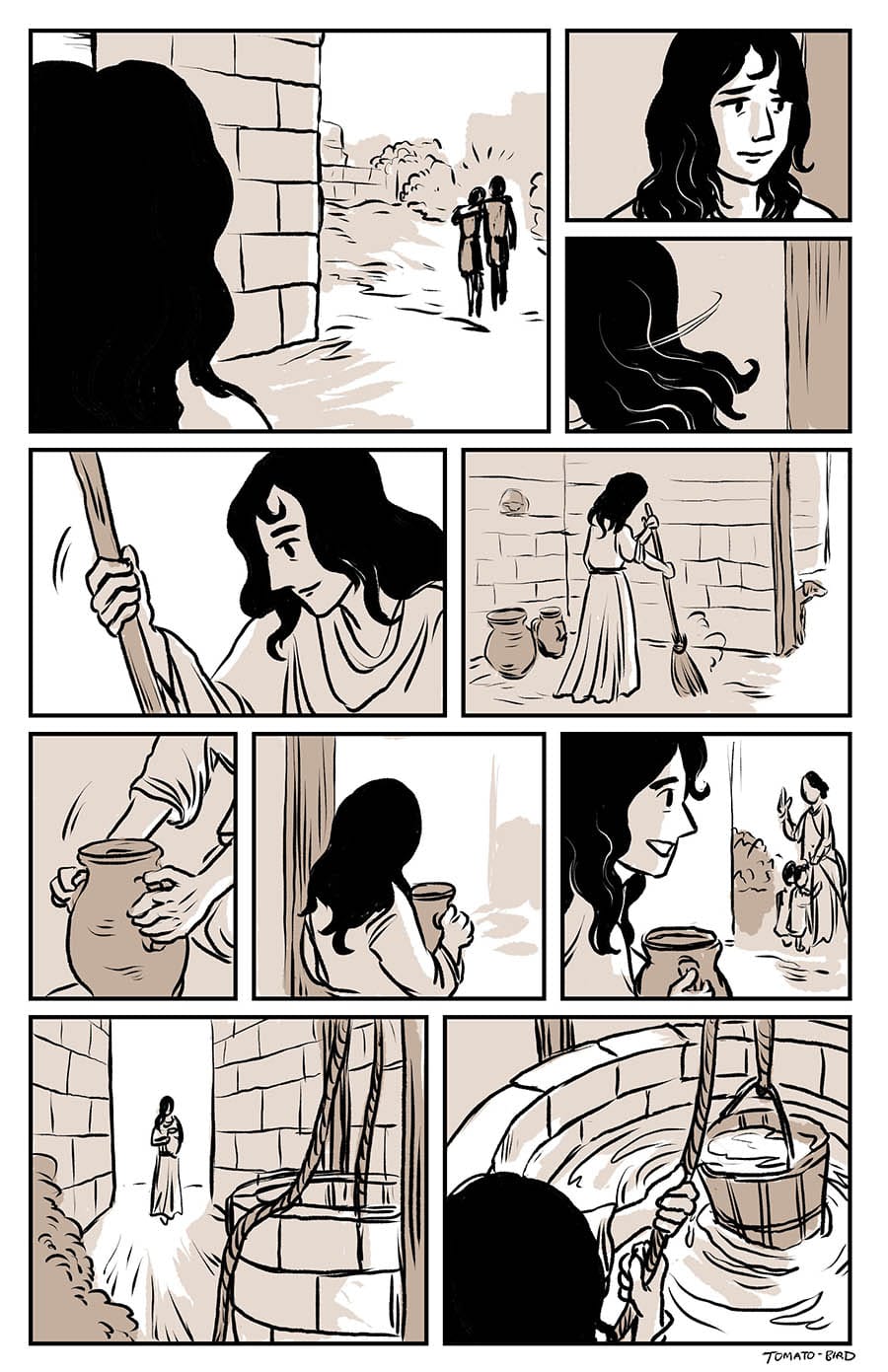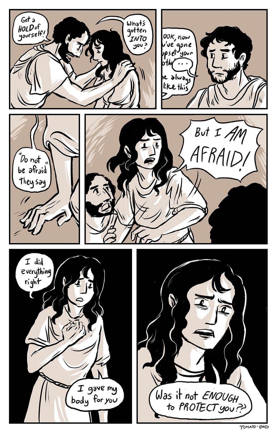 This comic was originally inspired by the fact that so much art depicting Mary and Jesus traditionally usually focus on either Jesus’ birth or his death, and very little about their relationship in the time between, especially when it comes to Jesus’ life before he started his ministry at “around thirty years of age” as the Gospel of Luke states. With this story, I wanted to give a little view of Mary and her life, showing how she related to her son, her husband, and the world that they lived in. Mary is someone who, in scripture, is aware of herself, her world, and her situation, who “ponders things in her heart” and who proclaims and gives prophecy of God “casting down the mighty from their thrones and uplifting the humble.”