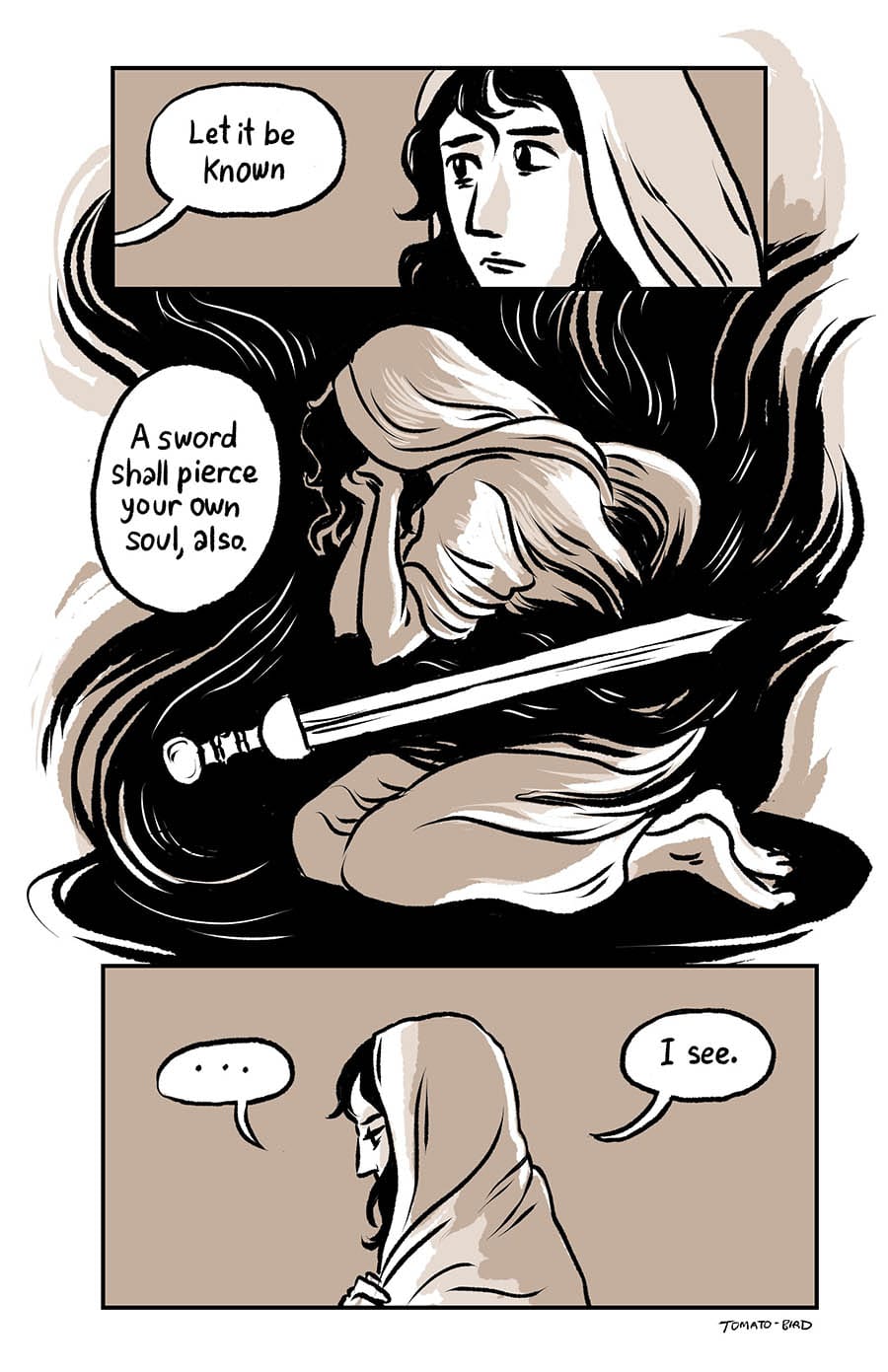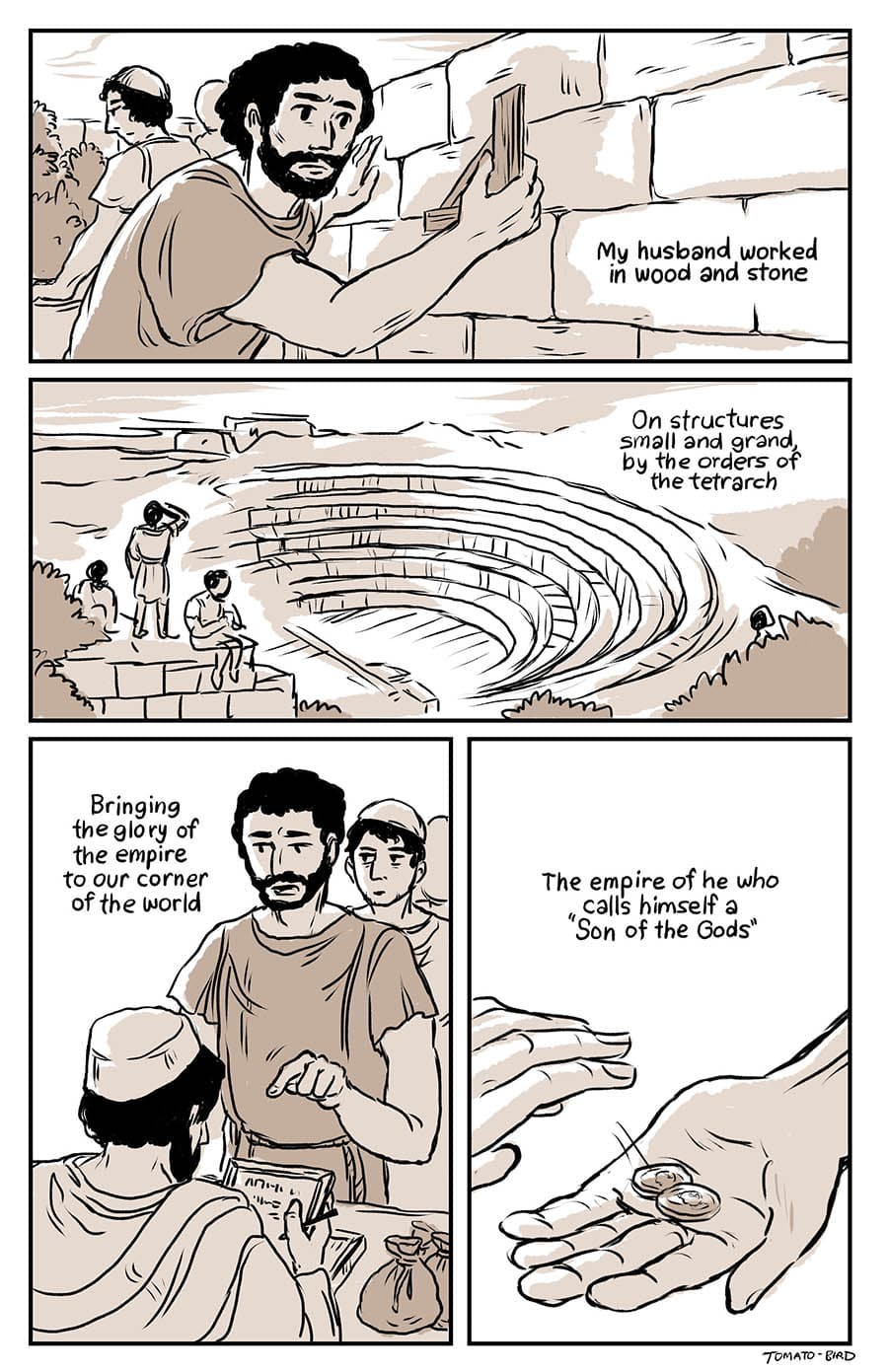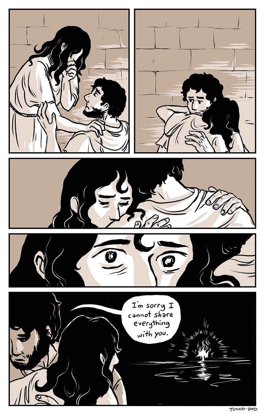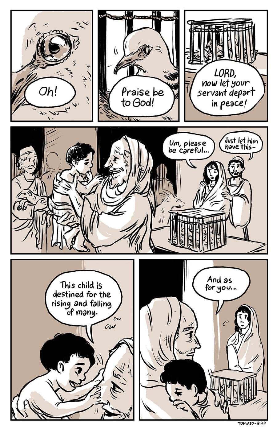 This comic was originally inspired by the fact that so much art depicting Mary and Jesus traditionally usually focus on either Jesus’ birth or his death, and very little about their relationship in the time between, especially when it comes to Jesus’ life before he started his ministry at “around thirty years of age” as the Gospel of Luke states. With this story, I wanted to give a little view of Mary and her life, showing how she related to her son, her husband, and the world that they lived in. Mary is someone who, in scripture, is aware of herself, her world, and her situation, who “ponders things in her heart” and who proclaims and gives prophecy of God “casting down the mighty from their thrones and uplifting the humble.”