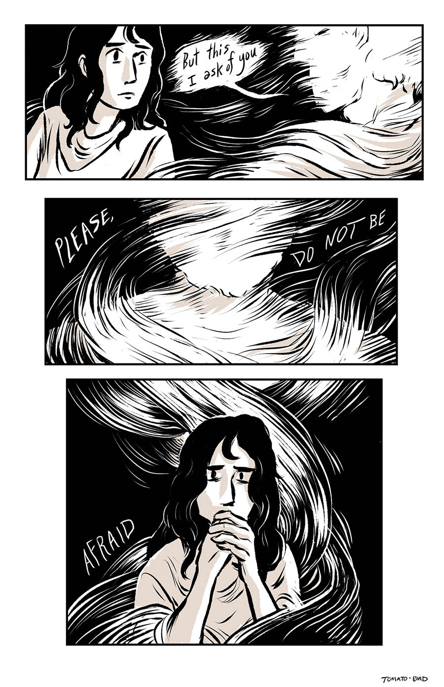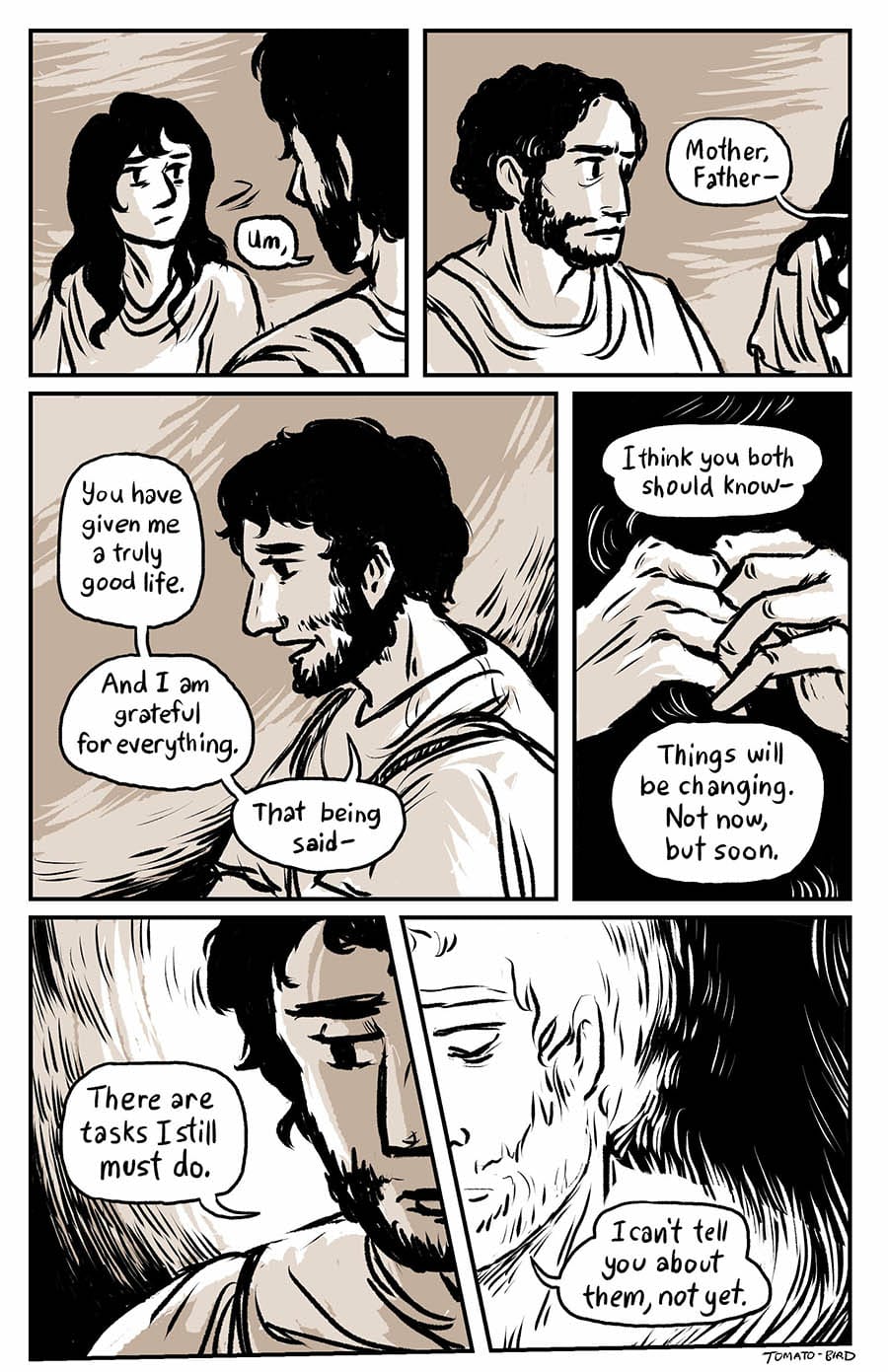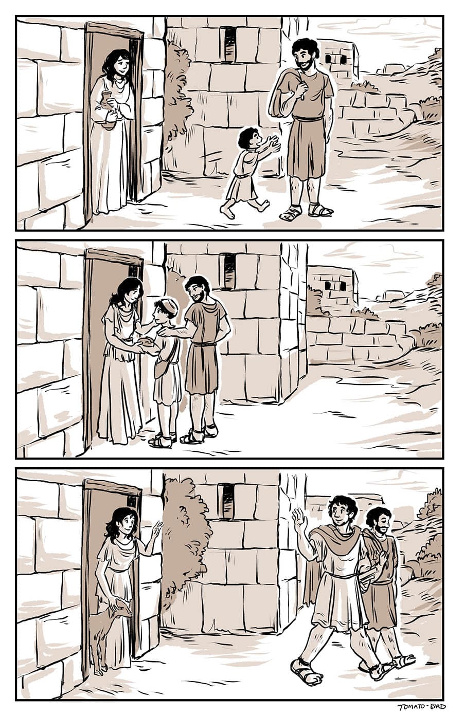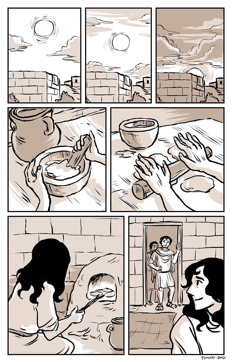 This comic was originally inspired by the fact that so much art depicting Mary and Jesus traditionally usually focus on either Jesus’ birth or his death, and very little about their relationship in the time between, especially when it comes to Jesus’ life before he started his ministry at “around thirty years of age” as the Gospel of Luke states. With this story, I wanted to give a little view of Mary and her life, showing how she related to her son, her husband, and the world that they lived in. Mary is someone who, in scripture, is aware of herself, her world, and her situation, who “ponders things in her heart” and who proclaims and gives prophecy of God “casting down the mighty from their thrones and uplifting the humble.”