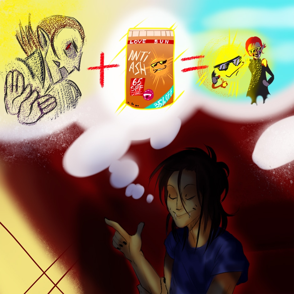 despite being a high-blooded vampire or boy likes sunny weather! Just let him put some sunscreen on... oh-oh! well, he's not giving in, those are the last bright days in the year. Gotta cover up!