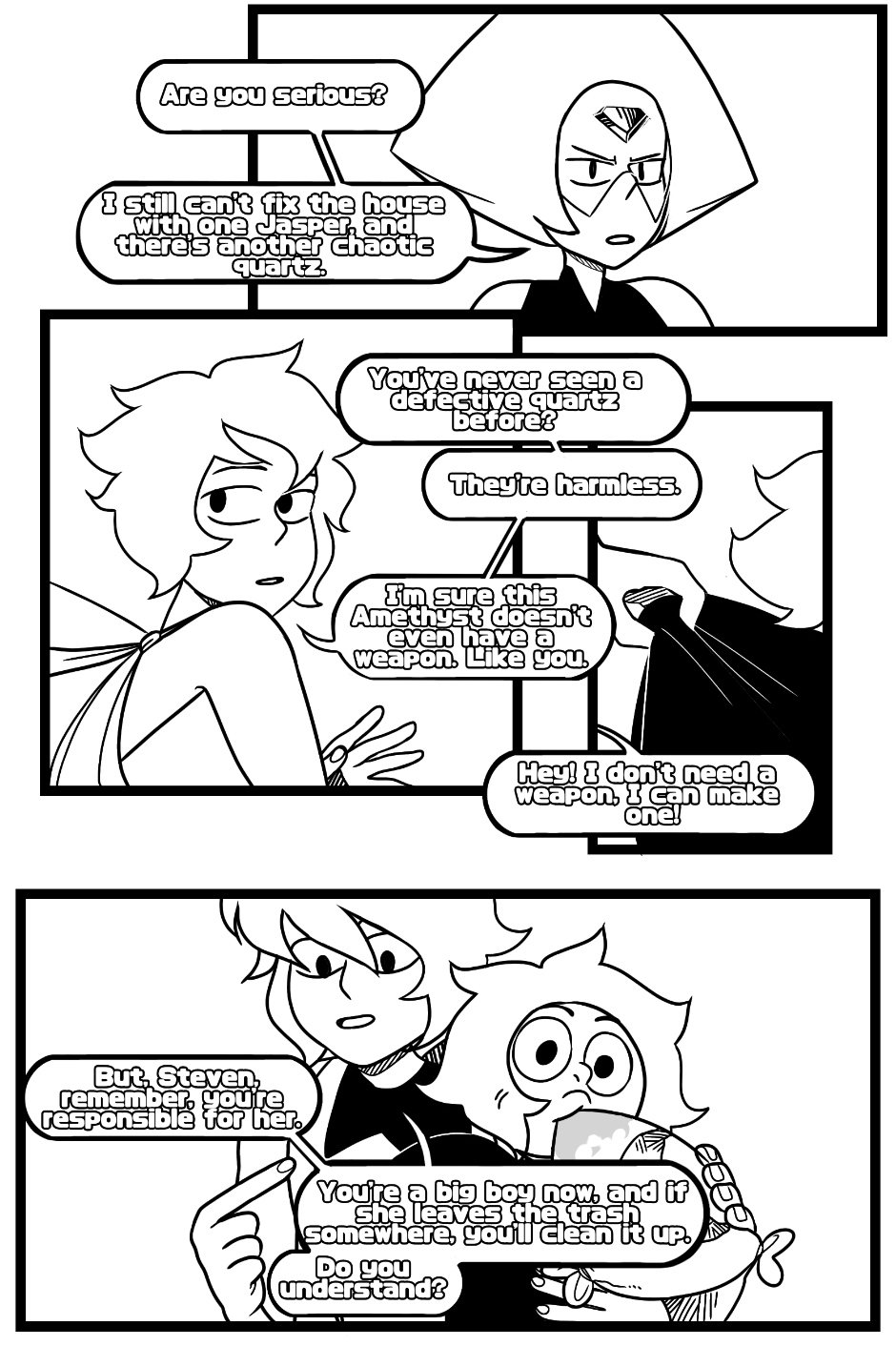 Steven is a little boy who lives in a ruined temple with three gems: Lapis, Peridot and Jasper. Steven is a gem, too, but his gemstone, his mother's gemstone, is different. For 14 years he lived in his little world, but now everything is beginning to change...