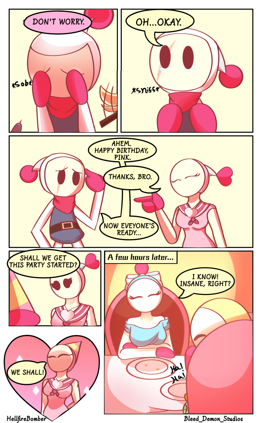Bomberman Galaxy is a story that follows Pink and White Bomber (aka Bomberman himself). Part of a rebel group called the Bomberman Bros, they travel around the star system to spread the idea of free will and stop the Five (now Four) Dastardly Authority. But as time goes on, Pink slowly learns about the truth of one of their members, Pretty Bomber. Will Pink face the music, or shatter and explode when everything falls into place?