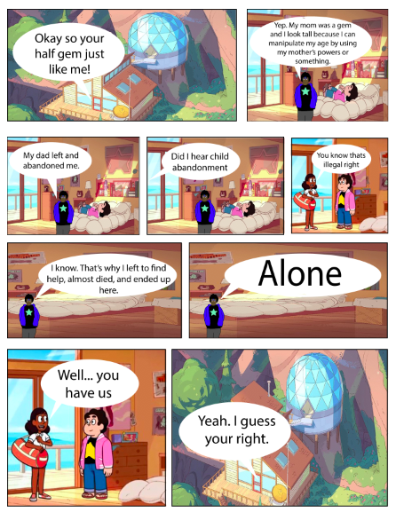 After Change Your Mind, the corrupted gem Blue Moissanite gave up her form to her son leaving him alone with his father. Now he is an orphan struggling with his identity. Due to his mother's abilities he is 13 years old and ages faster than an average human. He has heard the Tale of Steven but this is his story.