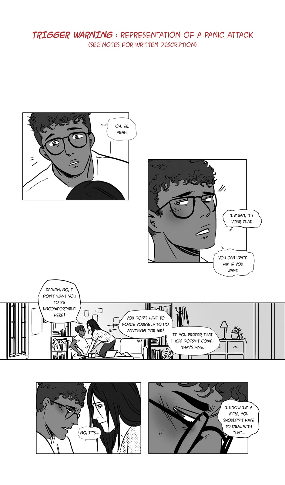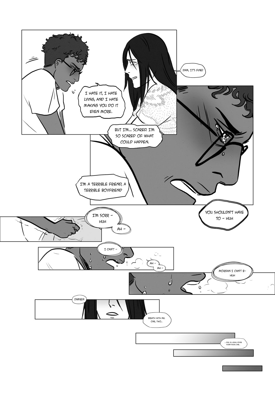 This scene was important for me to include, personally, and it was challenging to draw but also satisfying in a way? Coming out is not easy even when you trust the people around you, also I wanted to show how deep Damien's anxiety go.