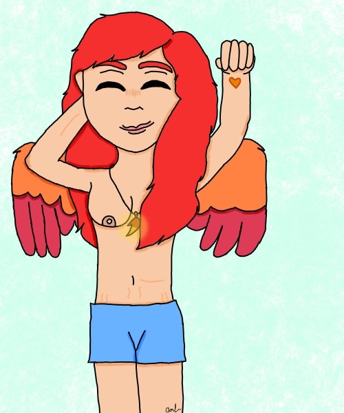 So, yeah, Phoe generally goes topless when sleeping, mostly because she feels comfortable that way (she's tried wearing pajama tops cut for her wings, but she just got annoyed with them after a while)