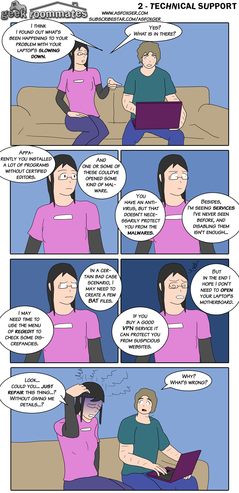 Geek Roommates tells the misadventures of two 20 year old nerdy roommates: Lauren, a girl who likes playing videogames and watching movies related to the nerd culture, mostly western nerd culture; and Earl, a boy who likes playing videogames (too!) watching anime and memes. Follow their lives with their vast cultural differences!