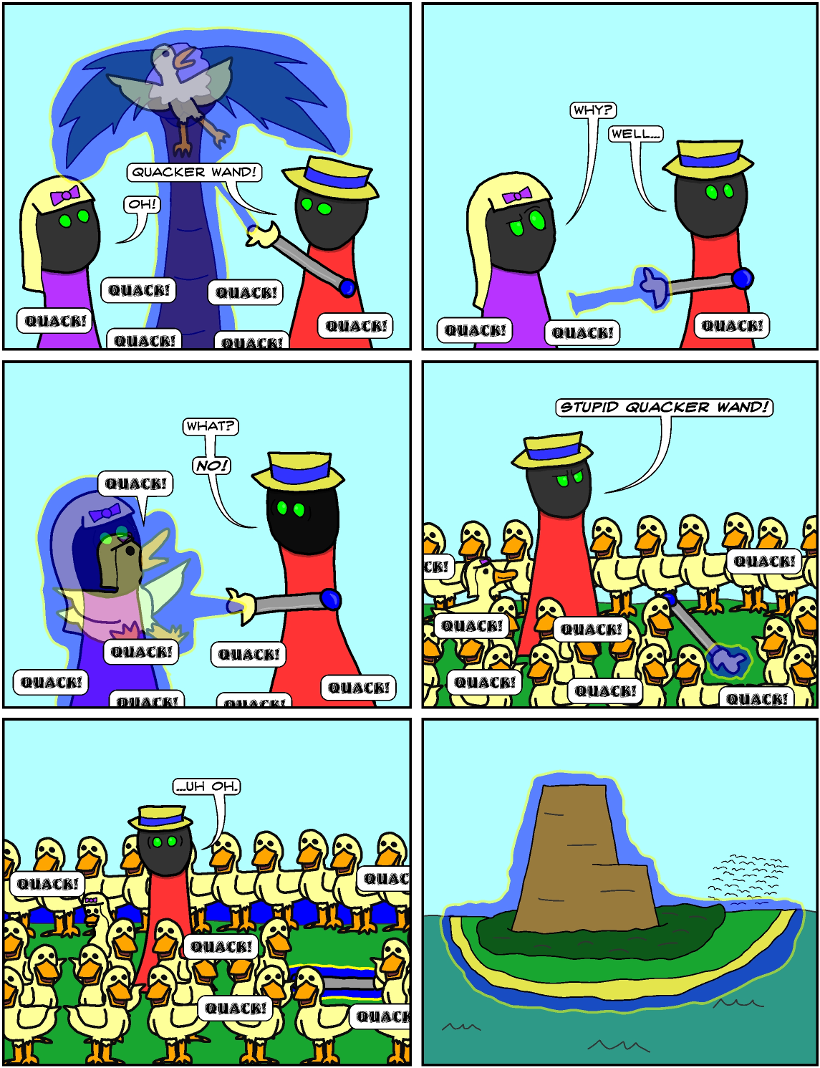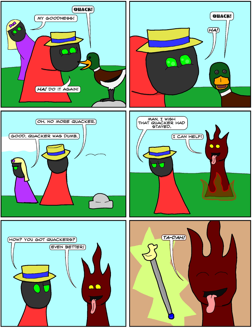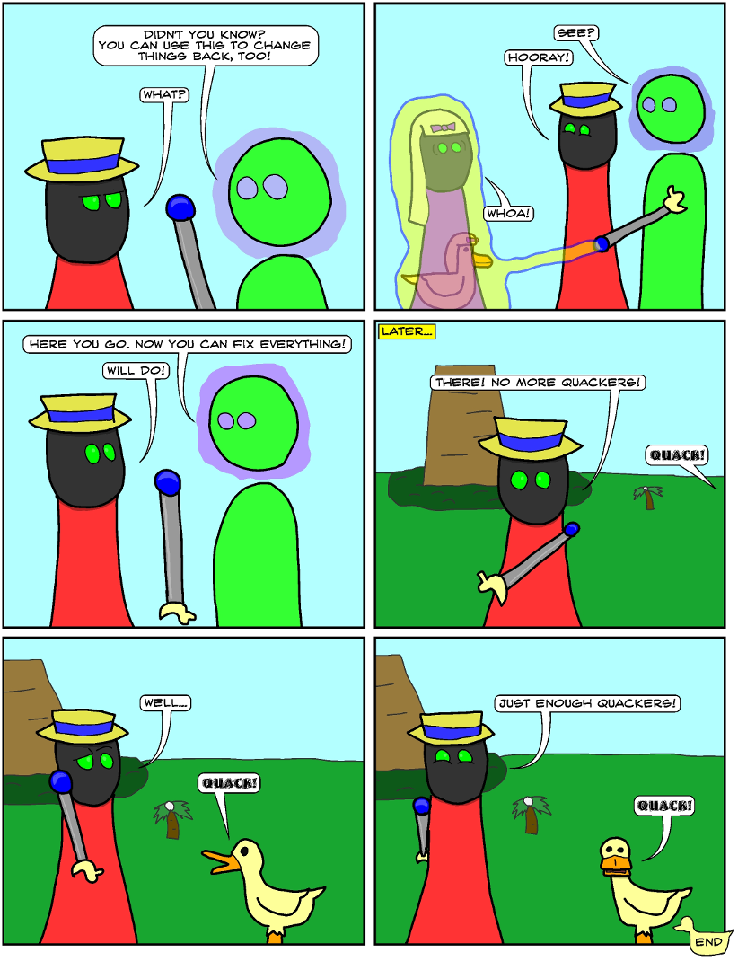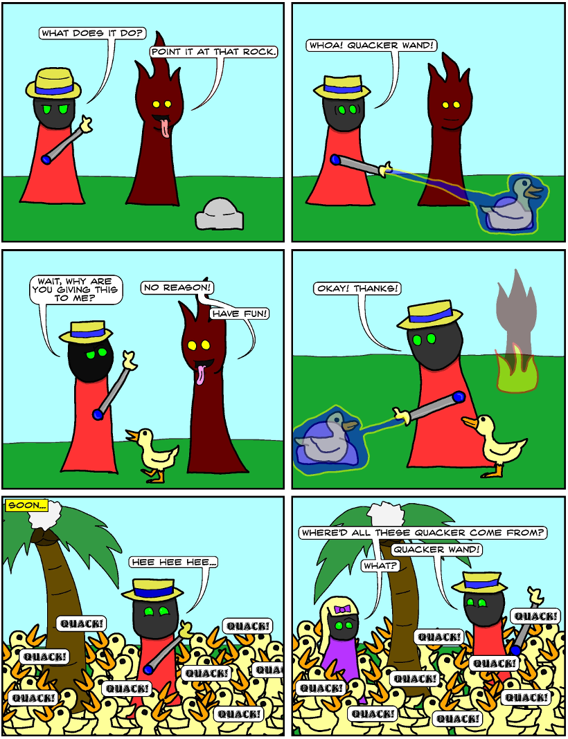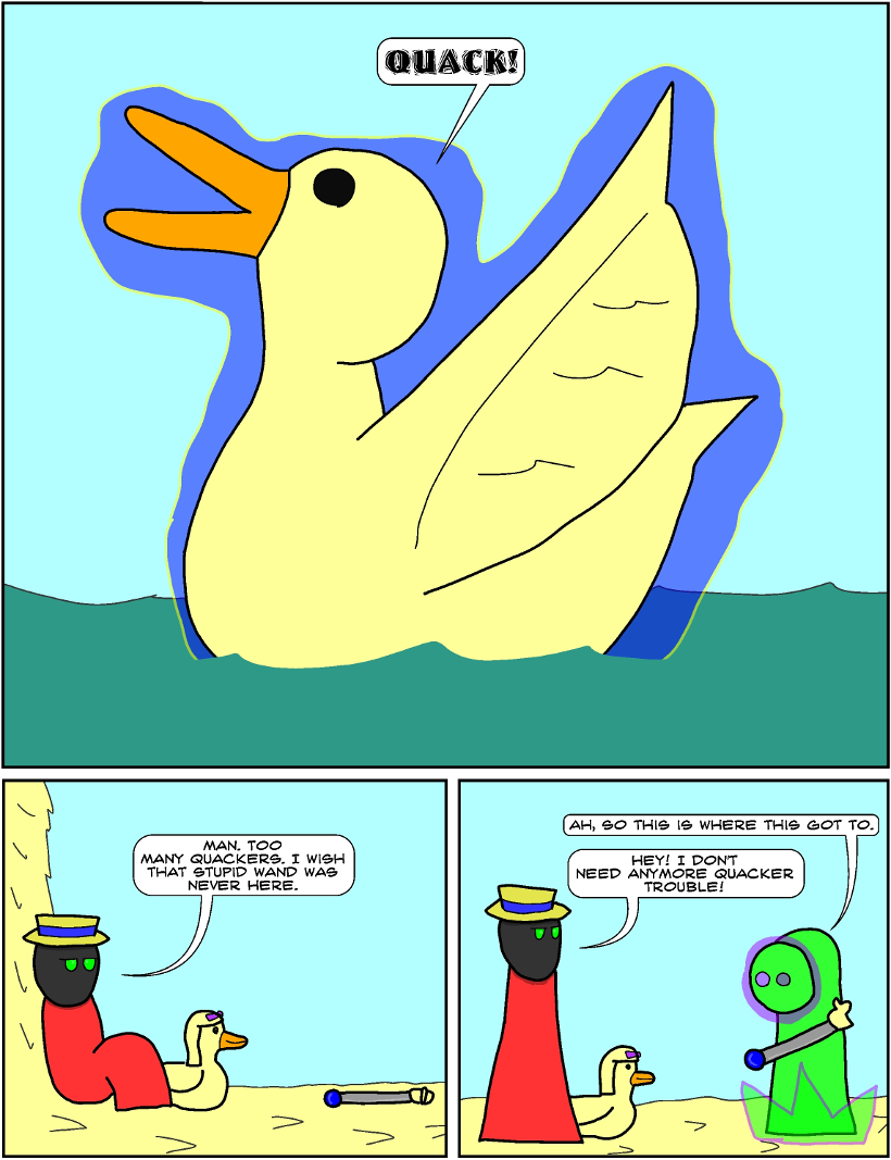 A being named Seymour obtains a wand that can turn things into ducks.