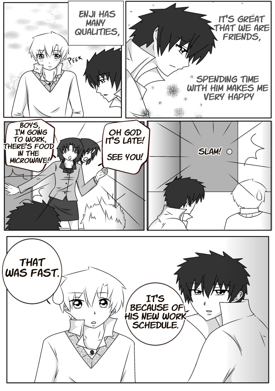 Toru discovers that he is in love with his best friend Enji, And the fear that his friendship with Enji will be damaged if he discovers it, will make him hide his feelings.