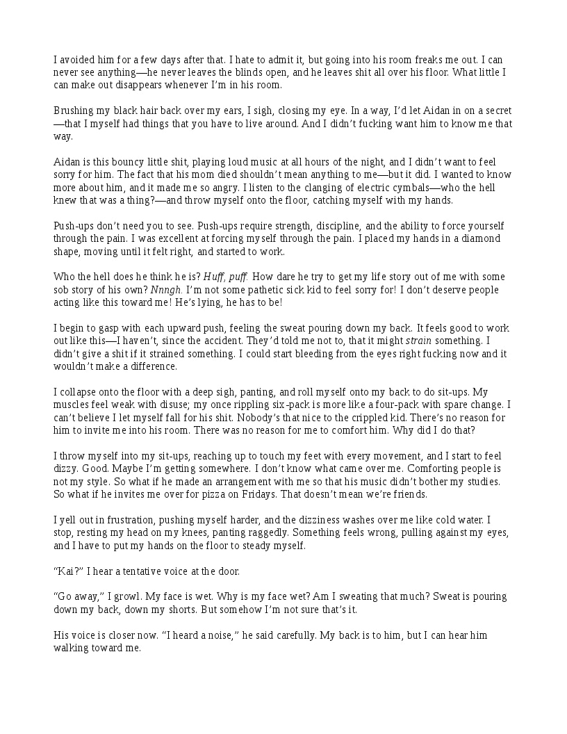Kai lost most of his sight in an accident that he won't--can't--talk about. He's a junior when he transfers to Courante University. He's still getting used to his new reality when he meets Aidan, the DJ next door--and Aidan finds something in Kai that he just won't let go of.