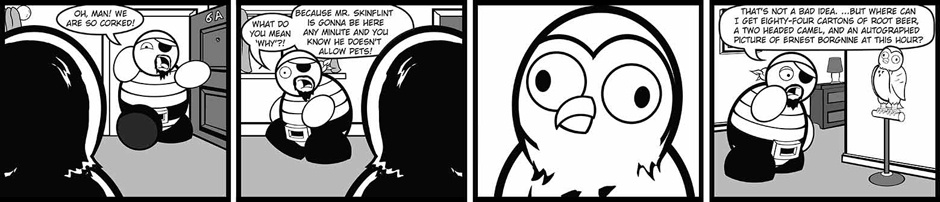 Ninja and Pirate have been roommates ever since Ninja graduated college, however life isn't as simple after school as one would hope. Whether it's falling in love with the Valkyrie next door, fighting with an owl, or getting abducted by intergalactic bounty hunters Ninja and Pirate's life is anything but run of the mill. A mix of character-driven storylines and one-off gag strips, Ninja and Pirate is a one of a kind goofy family-friendly romp that you won't regret guaranteed!*