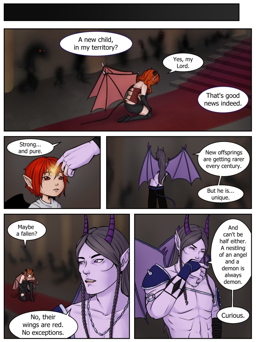 In the world of angels a child with demonic colors is born - it's something that never happened before. He is tossed down to the world of demons, where a female demon finds the little boy.