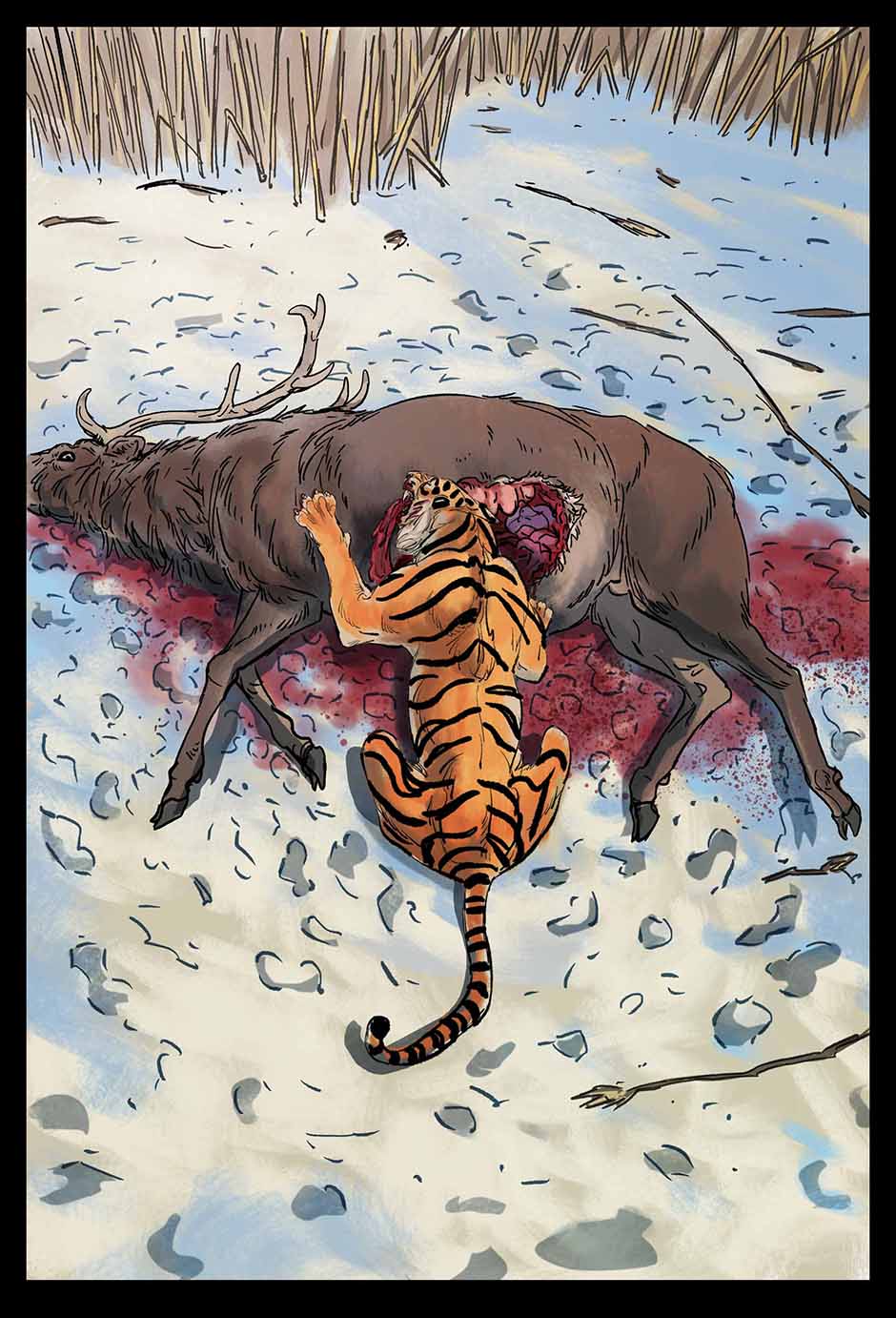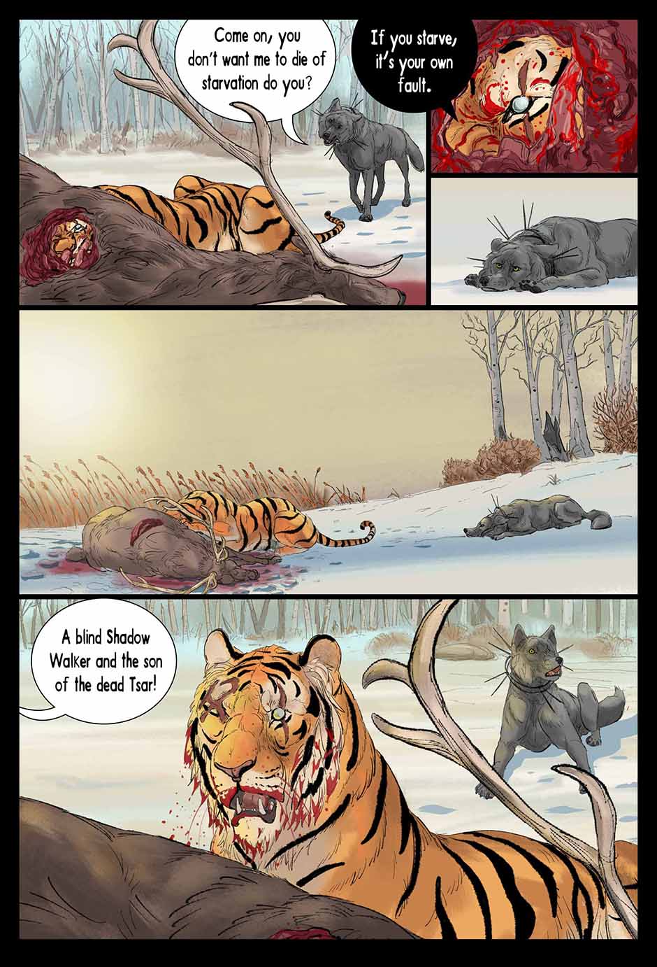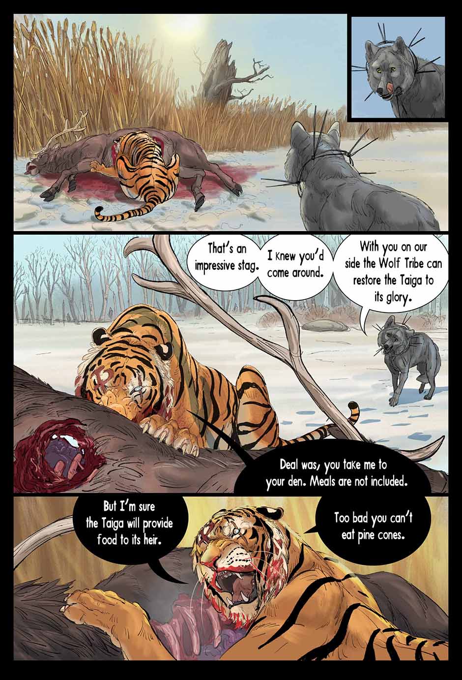 Set in a fictional post WW2 Russia an Amur Tiger lives alone in a forgotten prison camp in the far east. One eye was destroyed by the whip, the other branded and scarred with a sickle and hammer. Though blind, the Tiger learns how to see with the aid of his friend, Muzak the raven. The Tiger is unwittingly drawn into a larger conflict over the control of the Taiga (the great northern forest of Russia). The Tribe of the Wolf and the Clan of the Boar both vie for control and the Tiger becomes the tipping point and must chose the fate of the Taiga. Updates every Friday on Taptastic and ever Monday and Thursday on the direct website.