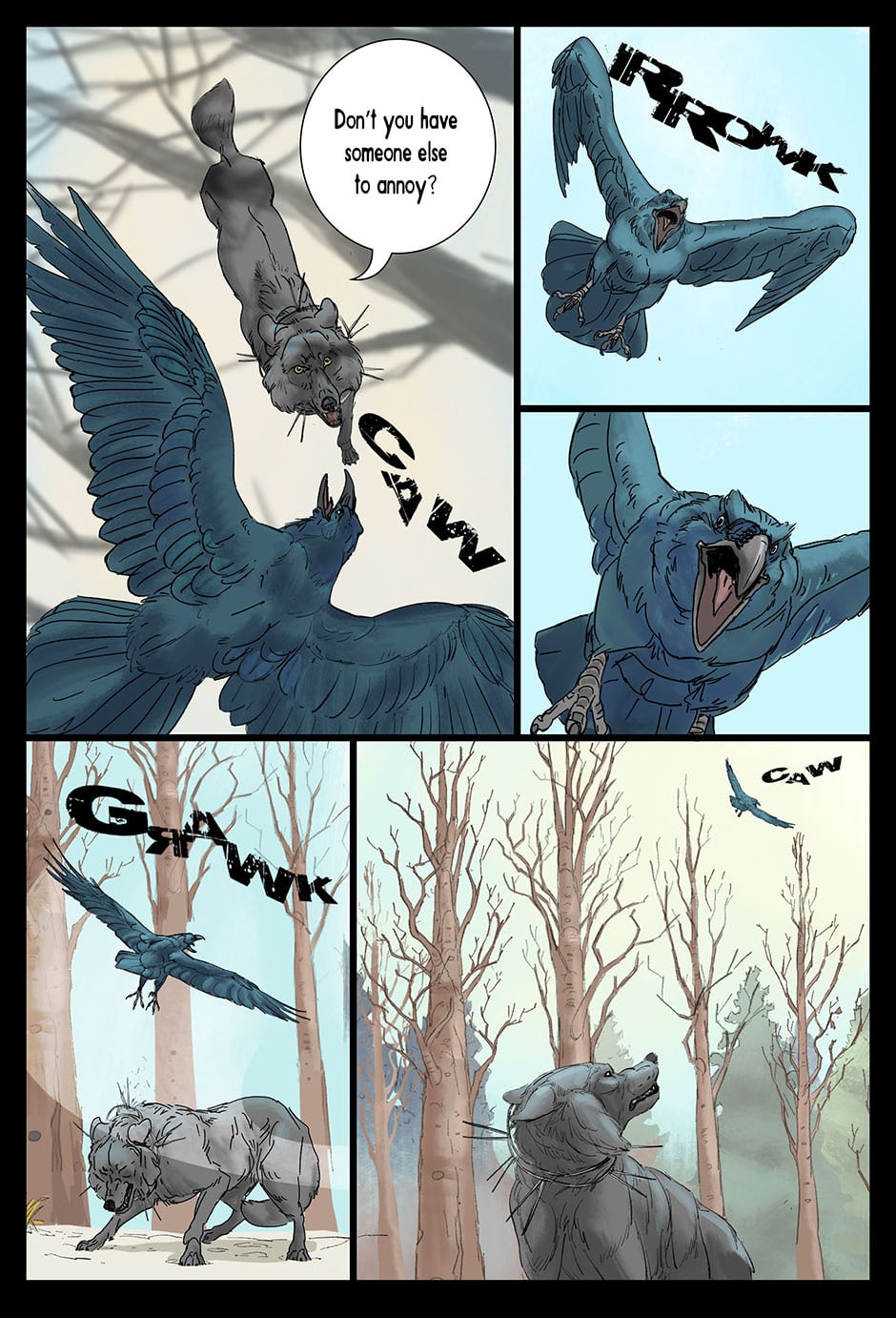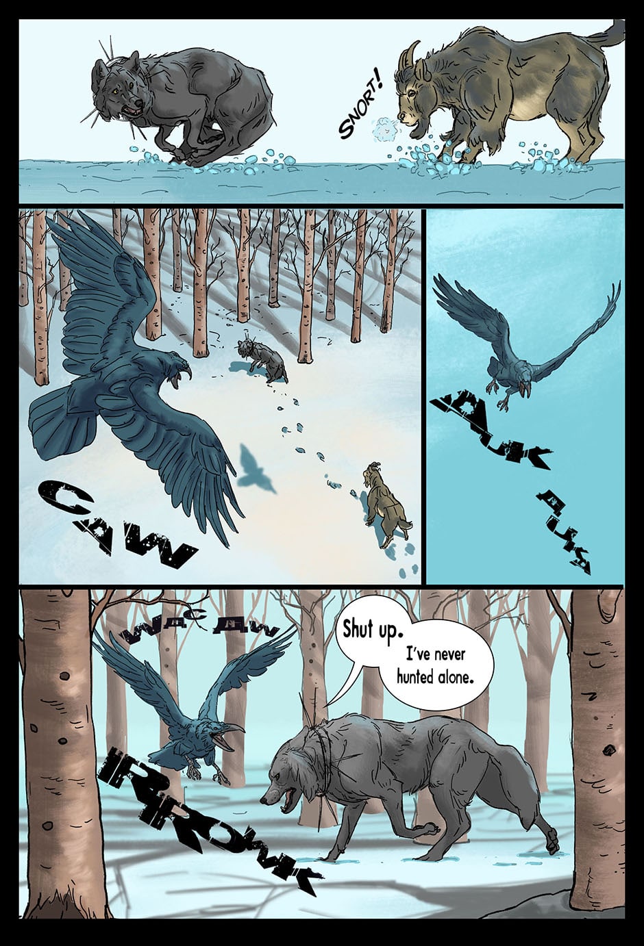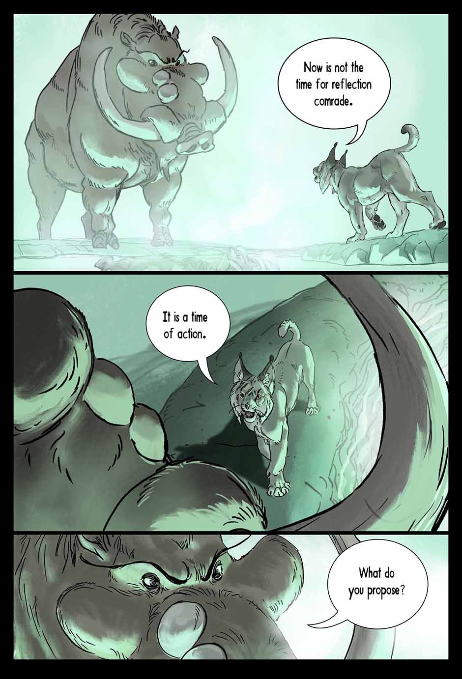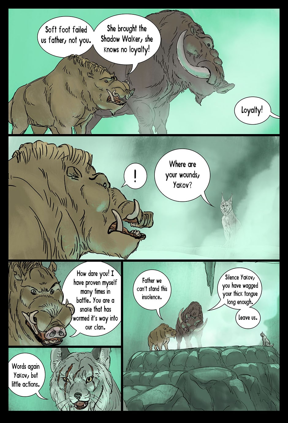 Set in a fictional post WW2 Russia an Amur Tiger lives alone in a forgotten prison camp in the far east. One eye was destroyed by the whip, the other branded and scarred with a sickle and hammer. Though blind, the Tiger learns how to see with the aid of his friend, Muzak the raven. The Tiger is unwittingly drawn into a larger conflict over the control of the Taiga (the great northern forest of Russia). The Tribe of the Wolf and the Clan of the Boar both vie for control and the Tiger becomes the tipping point and must chose the fate of the Taiga. Updates every Friday on Taptastic and ever Monday and Thursday on the direct website.