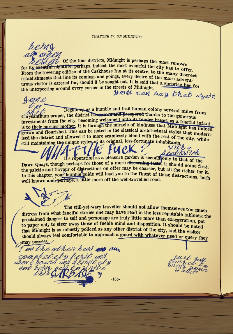 For our first break piece we have an extract from Bowman's Caskhouse guidebook! The original author may have had a... Somewhat different experience of the Midnight district to our detective, but Bowman's ready to correct the prose with his own observations...