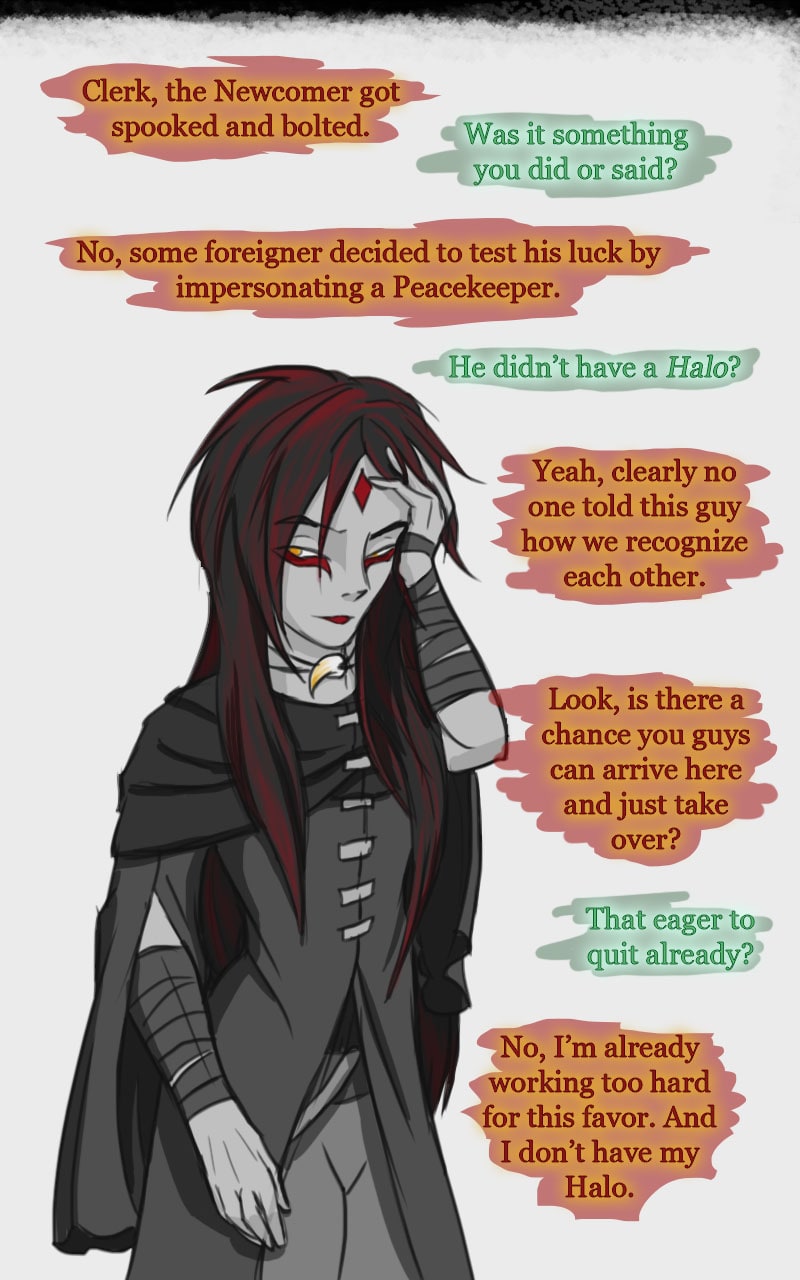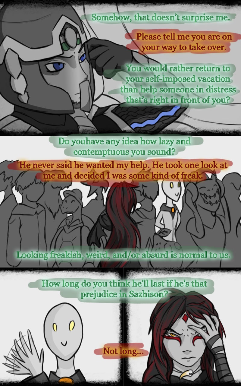 The Newcomer finds himself in a world beyond his imagining. Drawn by curiosity, a woman meets him. He holds onto her in the hopes to return home. She indulges him and learns that he is the target of a sick game. In his brief time, the Newcomer learns of his immediate fate; locking paths with a man with a playful smile. The Newcomer could return home to the safety of his old life, or begin anew, in her world. Made of Magic, a place where fantasy and science fiction combine; Sazhison.