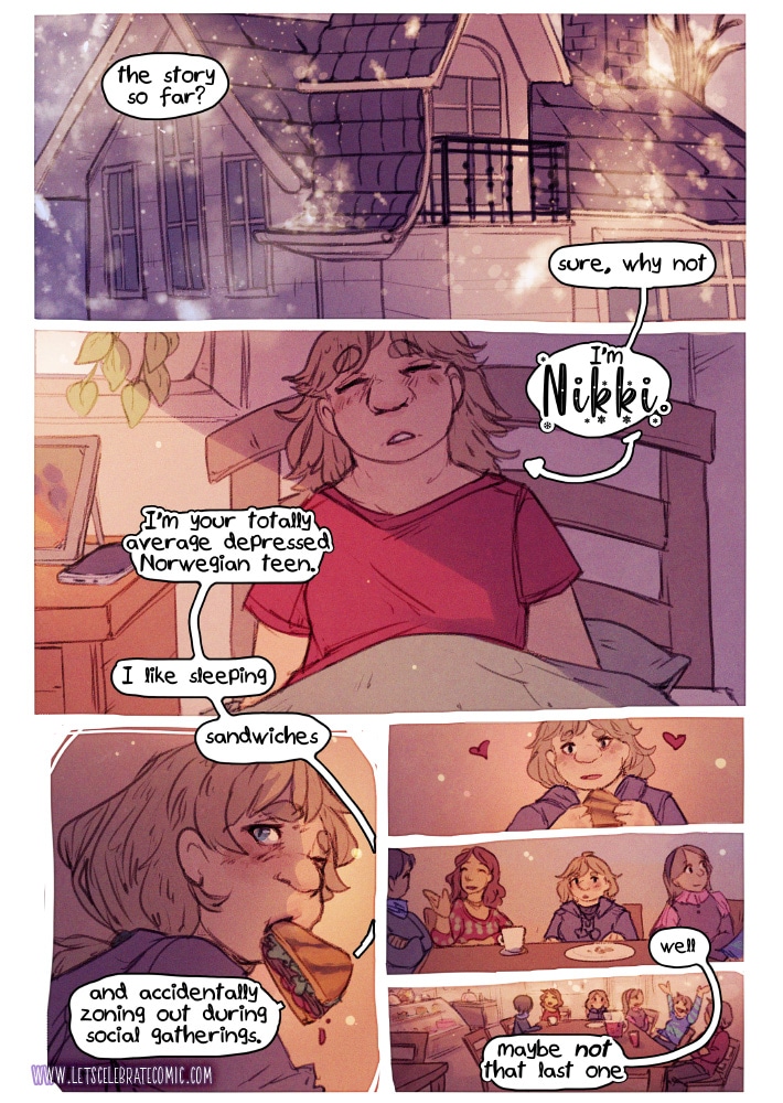 ongoing since 2014, Let’s Celebrate! is a slow-burn F/F adventure about friends-to-lovers, found family, and recovery. it was first released in grayscale and was rebooted in 2019 after a year-long hiatus in full colour and with a complete recap of the first two chapters; making it easy for new readers to jump right in!