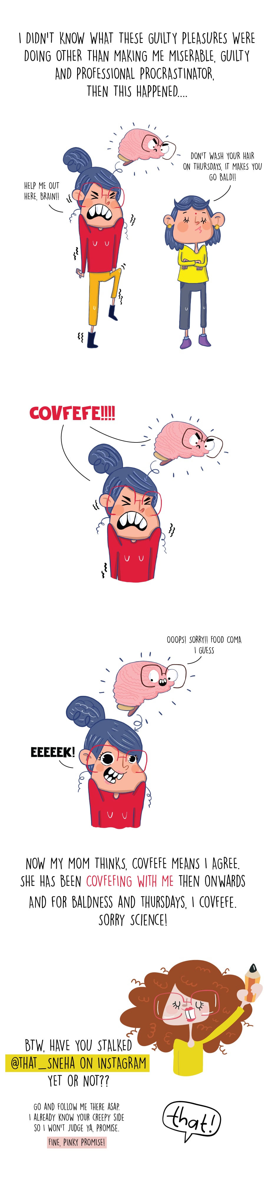 Do you have those days when all you sing all day is just one tune you hear in the morning, and it won't even be the song you like. I had the same case with the word - COVFEFE. So much so it became my favorite word! It was all because of my brain going into a food coma. Here is the complete story. And, yes, my mom does say washing hair on Thursdays make Sneha go bald. :/ Covfefe! (here it means peace)