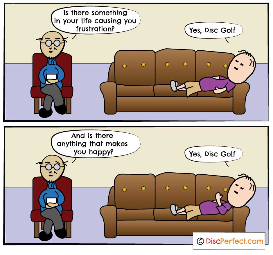 Disc golf can sometimes be a love hate relationship, from bomb drives to bad tree kicks. A roller coaster of emotions that may or may not require anger management therapy. https://discperfect.com/blogs/comics/therapy-session