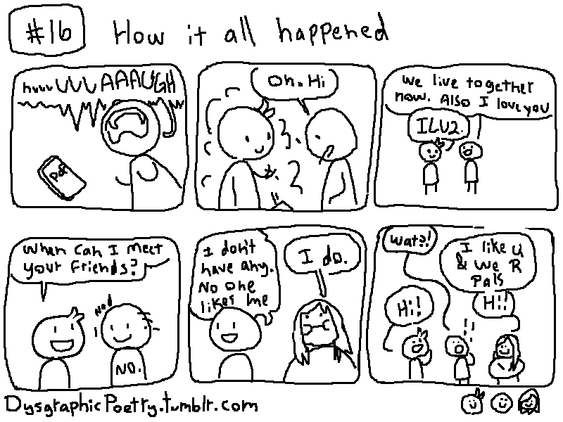 My name is Dakota, I have Dysgraphia and I make comics. Hi. Dysgraphic poetry is my work to embrace my disability as something beautiful and enriching, rather than limiting. Dysgraphia makes it difficult to write, and draw, so I choose to think that my making comics anyway is an act of self-love and defiance. Dysgraphic poetry will cover a wide range of topics including queerness, disability, and classism. Thanks for reading! #Dysgraphia #Dysgraphic #Dysgraphicpoetry