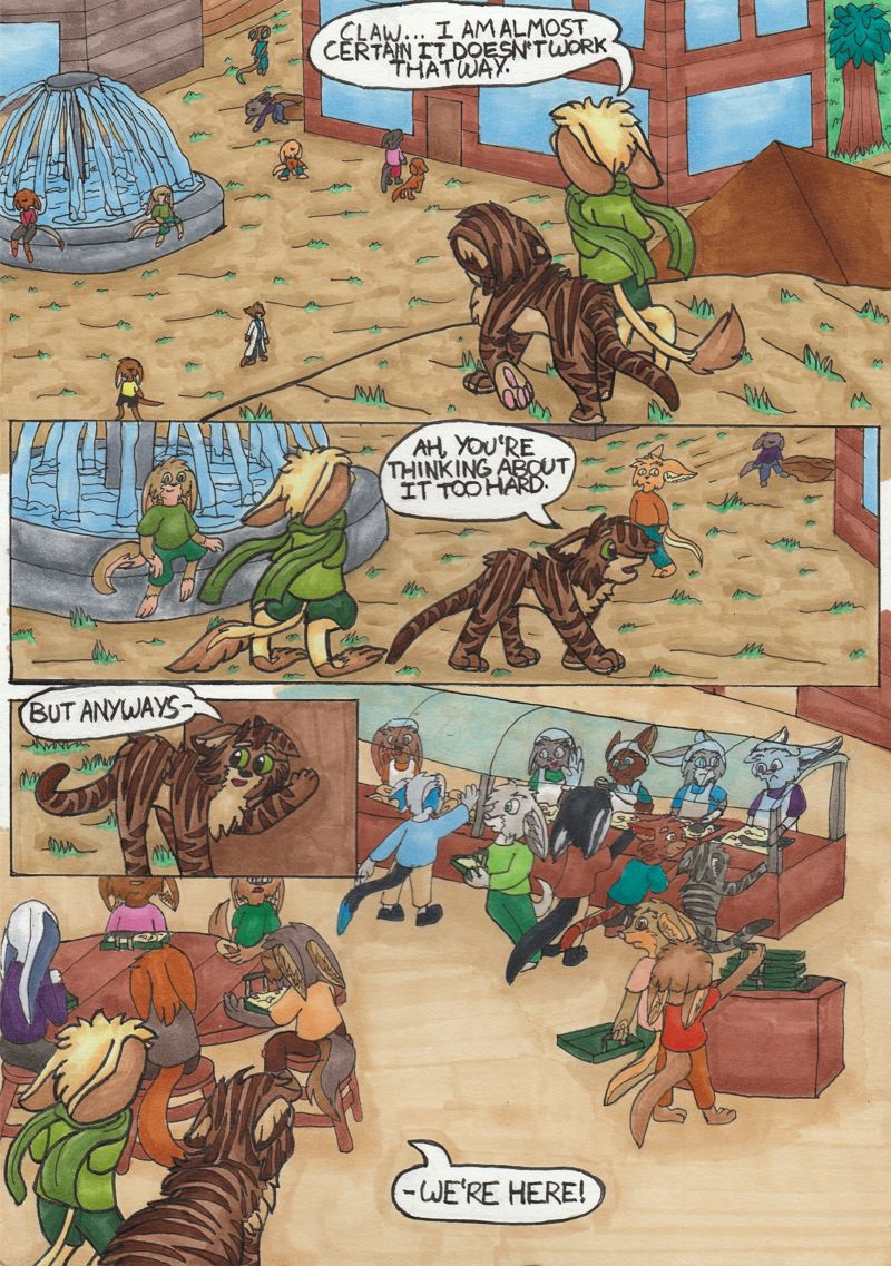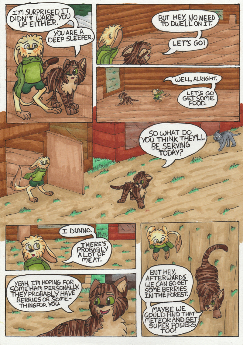 Here, we are introduced to two of our main characters, Claw and Sophie, and their adventure for food. Their colors are messed up for the first few pages, but they should be correct in the end.