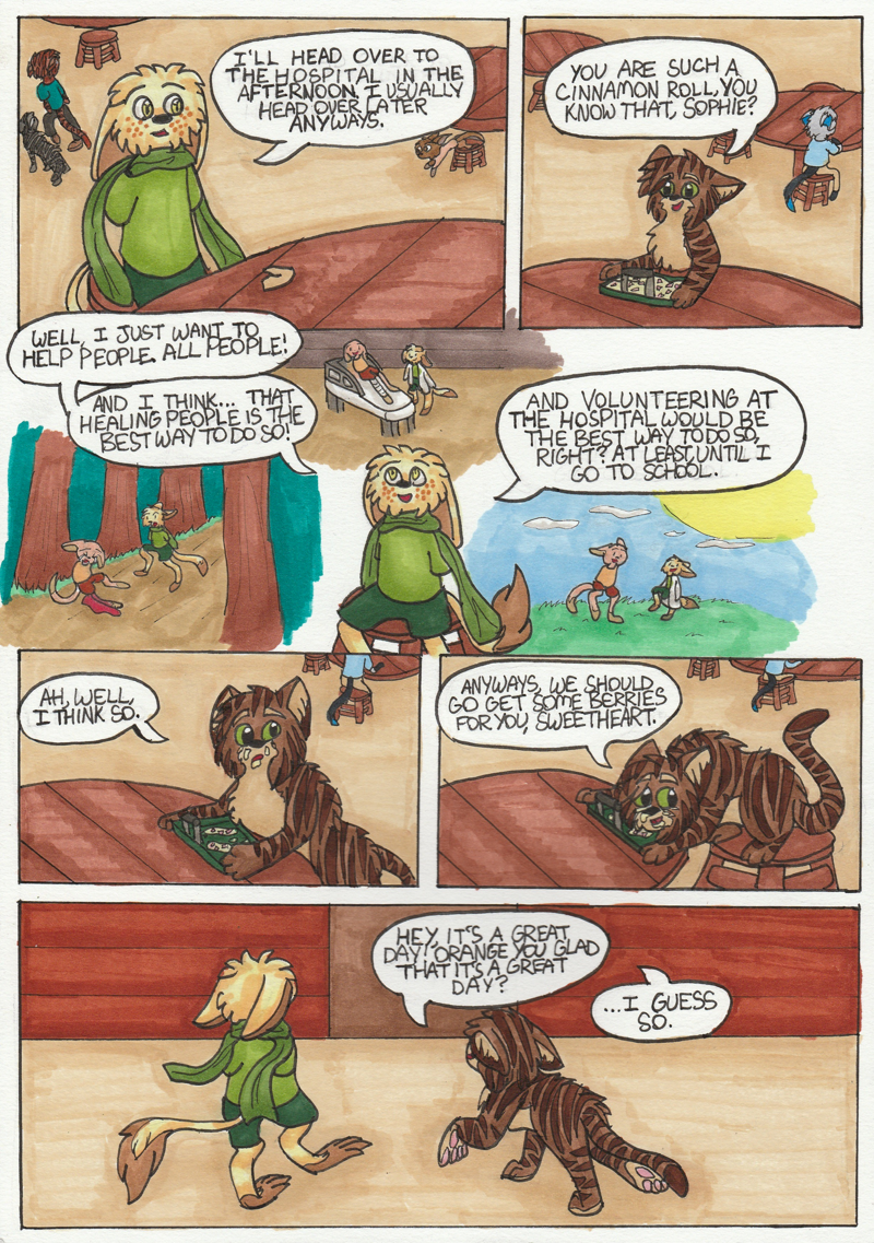 Here our characters find food and we learn a little bit more about them. Sophie, and how nice she is, as well as Claw, and how silly she may be. But now it's time for adventure, at least for berries.