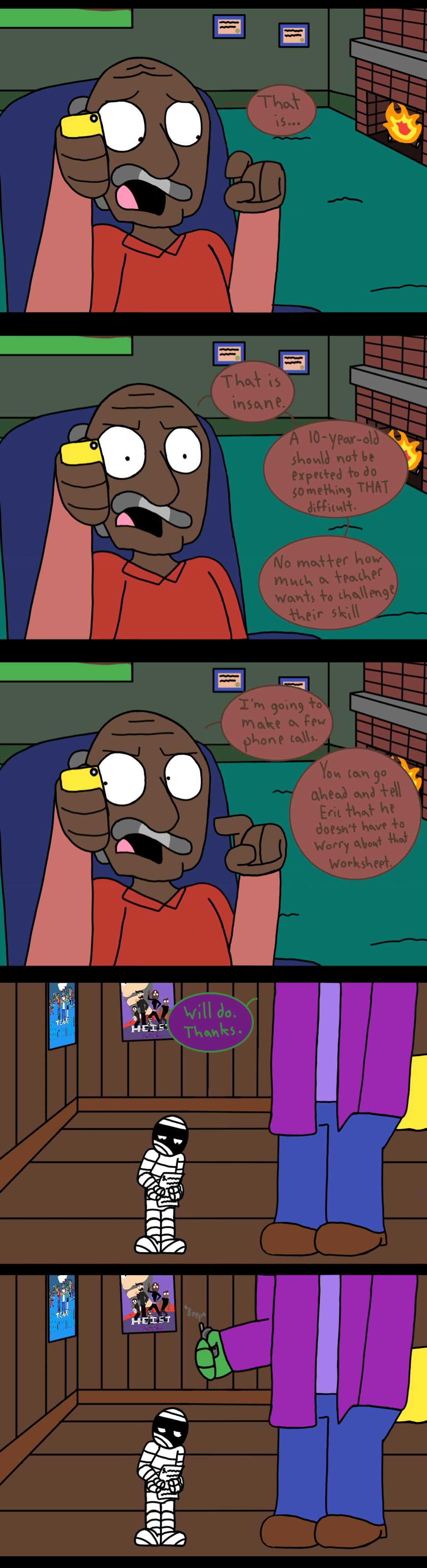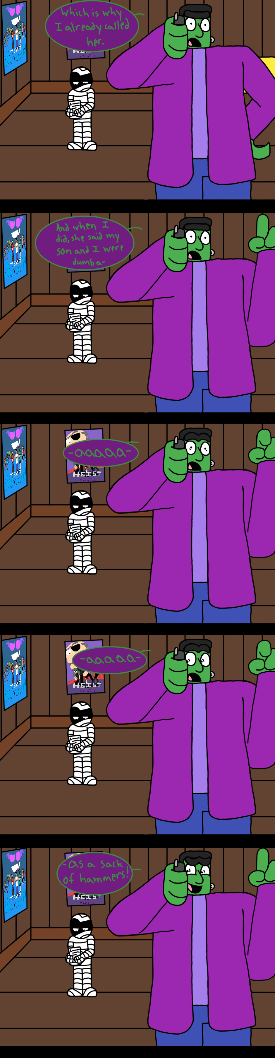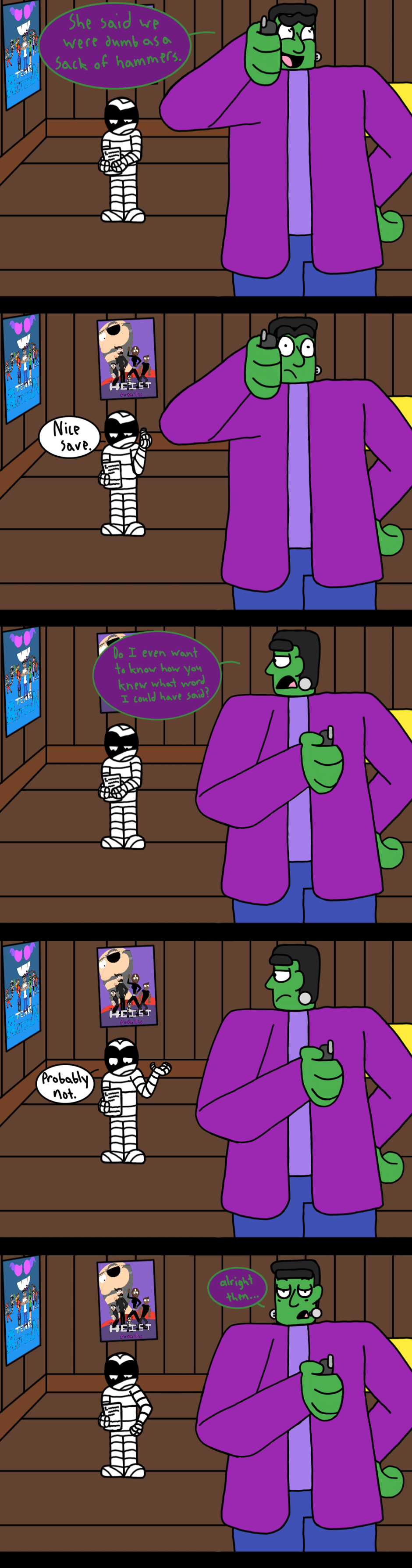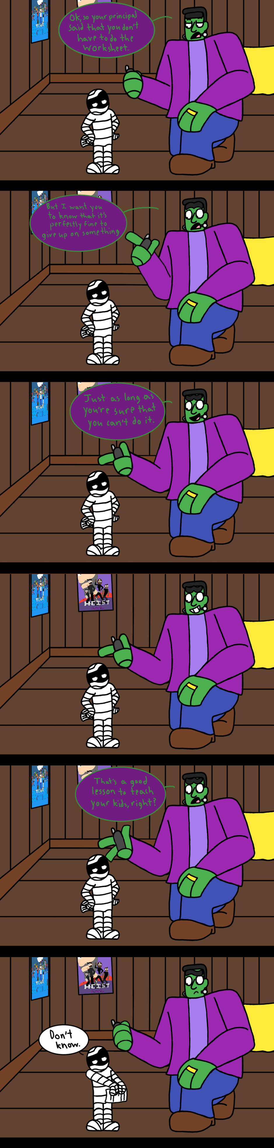 Note: I know that the odds of happening in the real world are less than slim to none, but here's the thing: I've created a world where a Frankenstein monster is helping his son, who is a mummy, with his math homework. I think I'm allowed a little leeway on what does and does not seem possible.