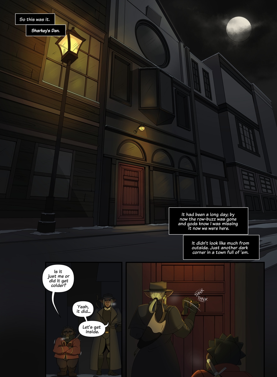 A fantasy-noir about trauma and recovery. The Caskhouse Casefiles follows Bowman, a veteran of a twenty-year war turned private investigator still haunted by his past as he takes on the criminals of Caskhouse, the meanest district in a dirty town. And with gangsters in every corner, assassins on the loose and a very literal femme fatale with her own agenda breathing down his neck it's not going to be easy... Updates Tuesdays and Thursdays.