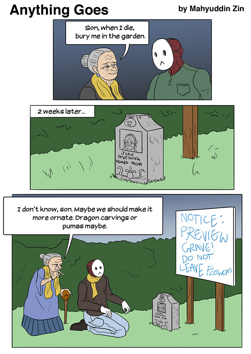 When I die, I want flamethrowers attached to my tombstone, constantly spewing fire so no creature will ever poop on it. Even bird poop would be vaporized before it hits the ground.