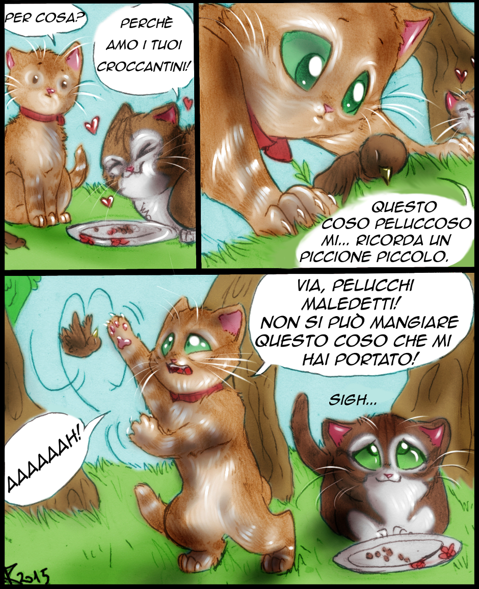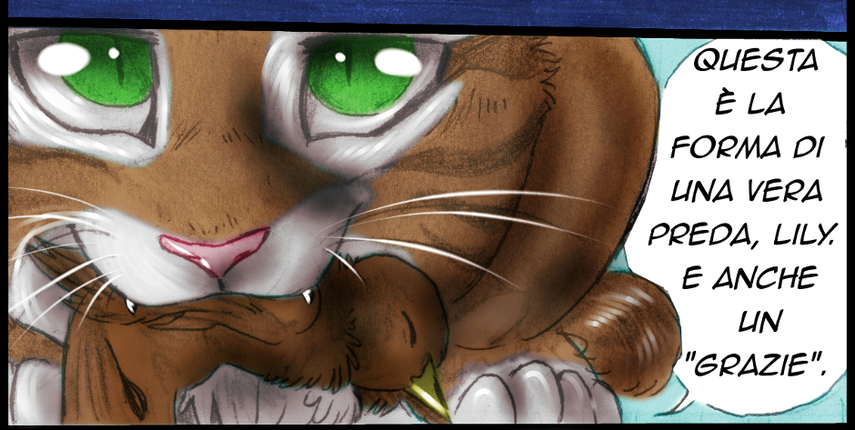 Gatto ha portato a Lily una piccola, vera preda: un uccellino. Lily non sapeva come mangiarlo, gli dava morsetti, lo ha buttato nel piatto, poi lo ha fatto volare per tutta la campagna e lo ha rovinato. E vabbè, un giorno imparerà. Alla fine, per fortuna, gatto ha deciso di mangiarsi l'uccellino da sé, sprecarlo non sarebbe stato il massimo...